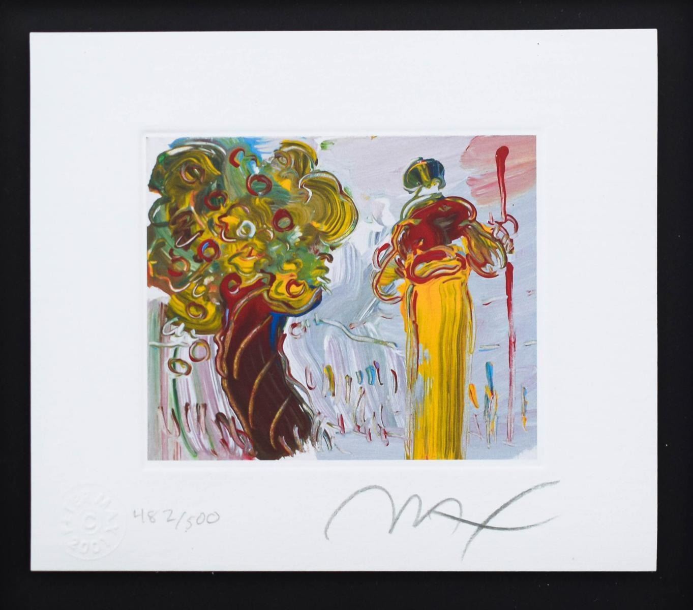 Artist: Peter Max. Medium: Original Lithograph. Title: Sage and Tree I (Mini). Size (Unframed): 5" x 6". Size (Framed): 13" x 13.5". Limited Edition: Numbered 482/500. Certificate of Authenticity: From Peter Max Studio. Additional: Custom framed. Reference# 13012.