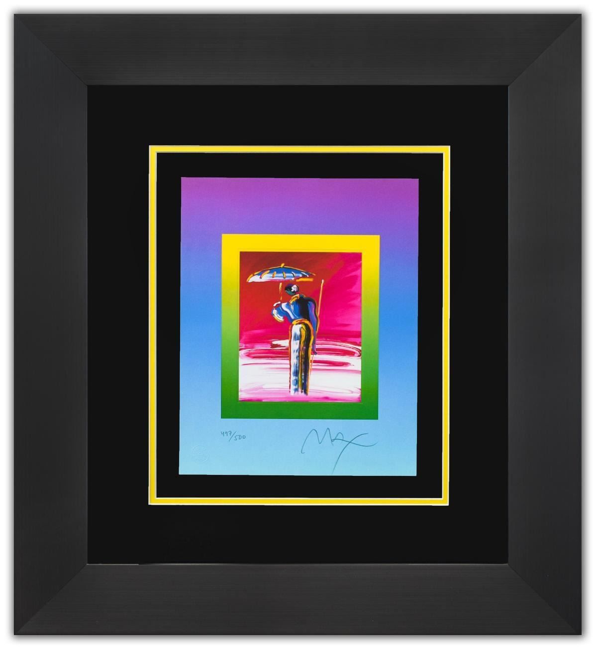 Artist: Peter Max. Medium: Original Lithograph. Title: Sage with Umbrella and Cane on Blends. Size (Unframed): 13" x 10". Size (Framed): 28" x 24". Certificate of Authenticity: From Peter Max Studio. Additional: Custom framed. Reference# 15172.