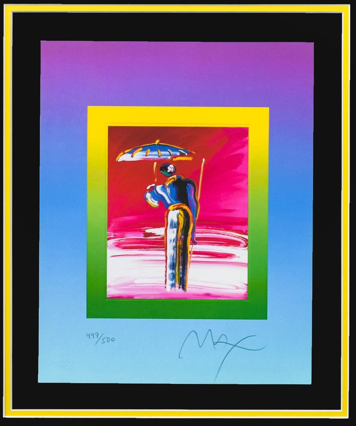 Artist: Peter Max. Medium: Original Lithograph. Title: Sage with Umbrella and Cane on Blends. Size (Unframed): 13" x 10". Size (Framed): 28" x 24". Certificate of Authenticity: From Peter Max Studio. Additional: Custom framed. Reference# 15172.