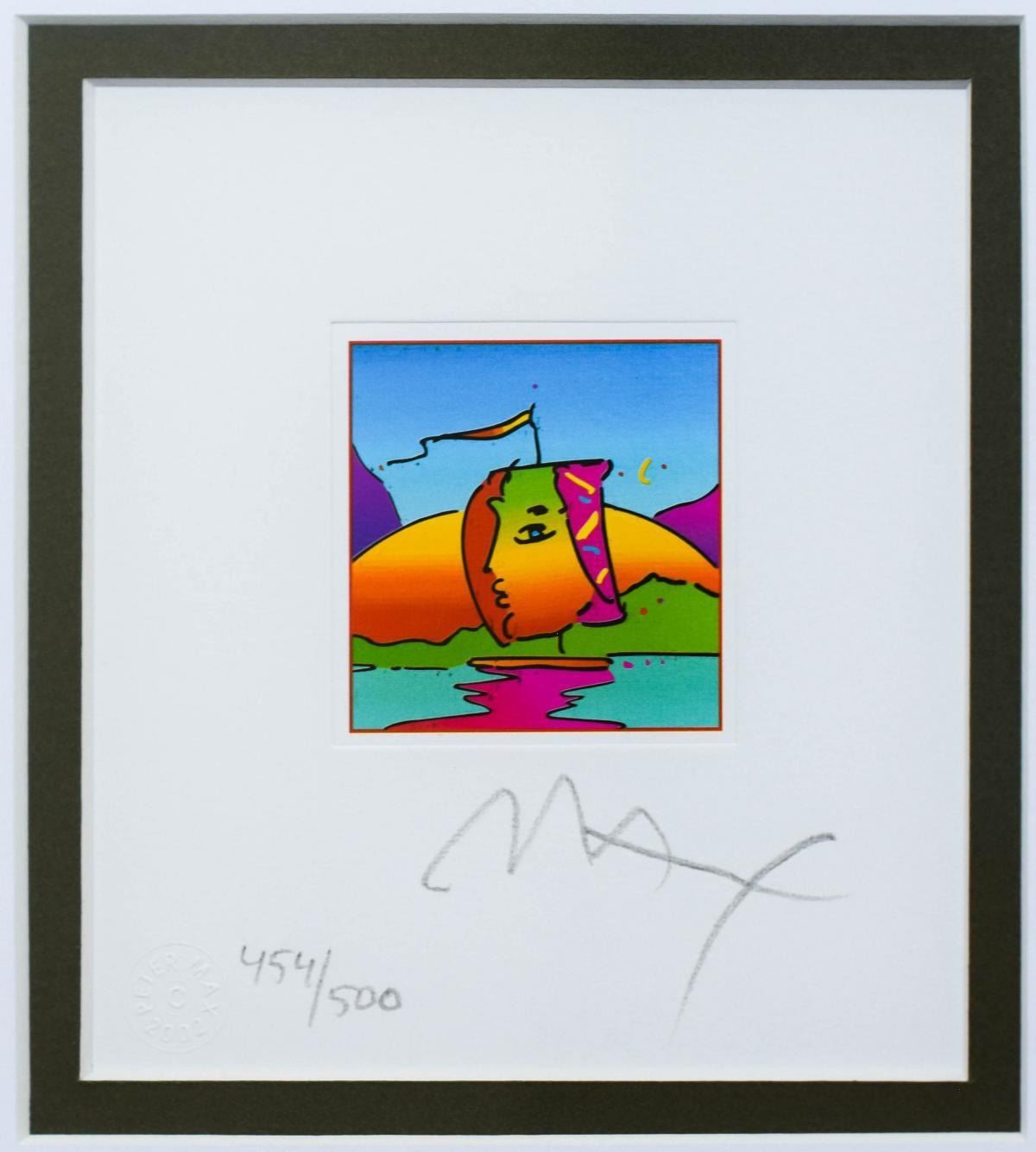 Artist: Peter Max. Medium: Original Lithograph. Title: Sail Profile (mini). Size (Unframed): 5" x 5". Size (Framed): 15" x 14.5". Limited Edition: Numbered 454/500. Certificate of Authenticity: From Peter Max Studio. Additional: Custom framed. Reference# 12127.