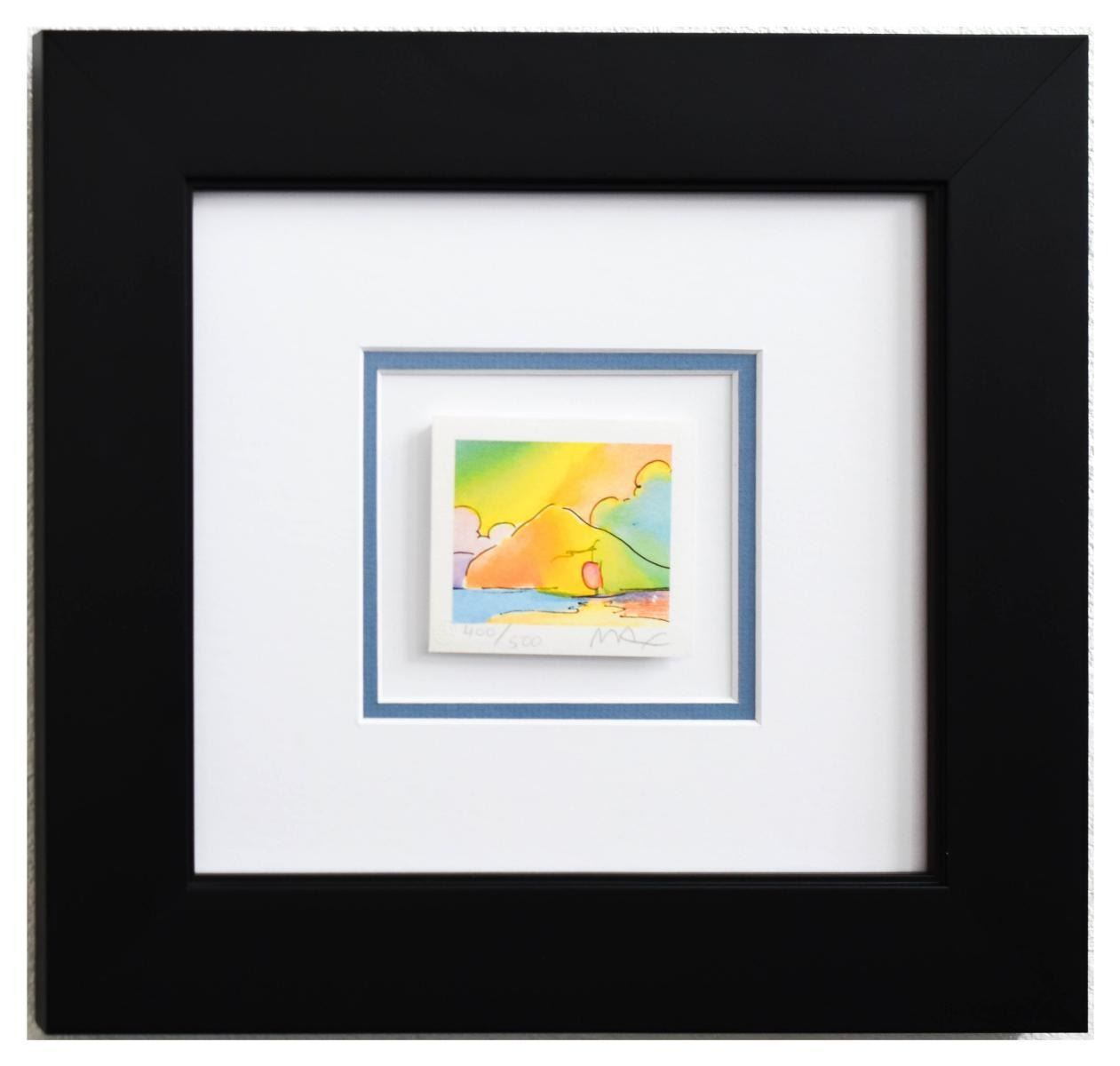 Artist: Peter Max. Medium: Original Lithograph. Title: Sailboat And Mountain View (Mini Series). Size (Unframed): 2.5" x 3". Size (Framed): 11.5" x 12.5". Limited Edition: Numbered 400/500. Certificate of Authenticity: From Peter Max Studio. Additional: Custom framed. Reference# 11744.