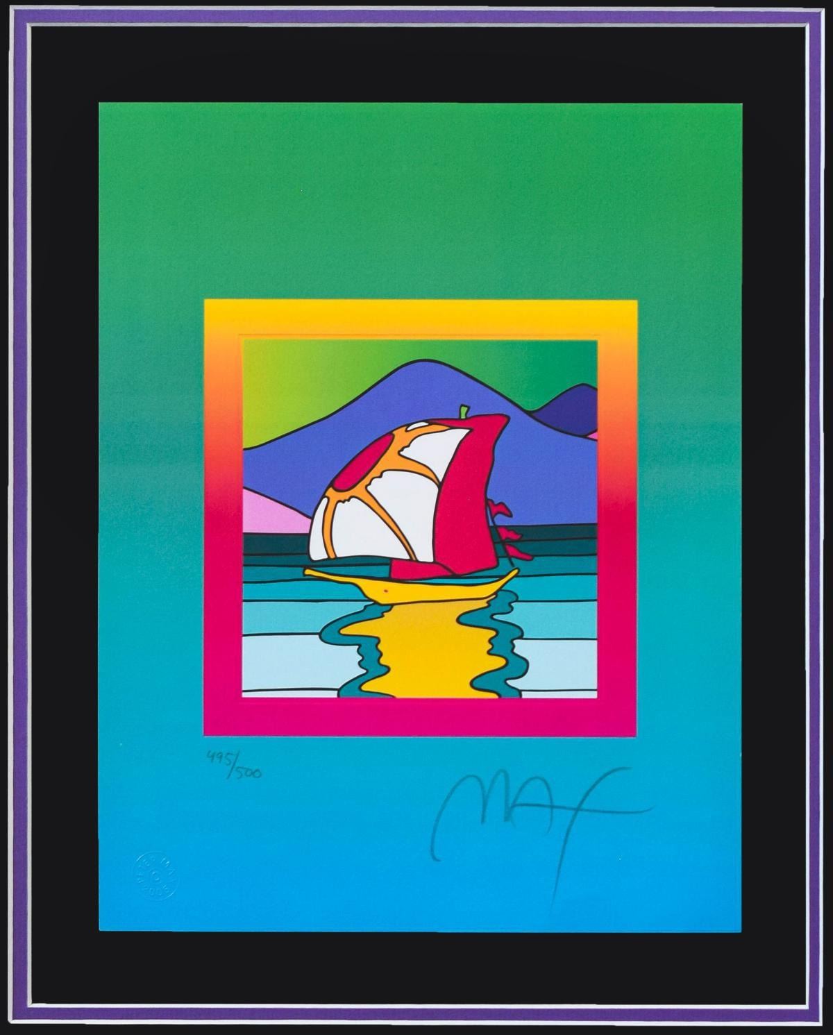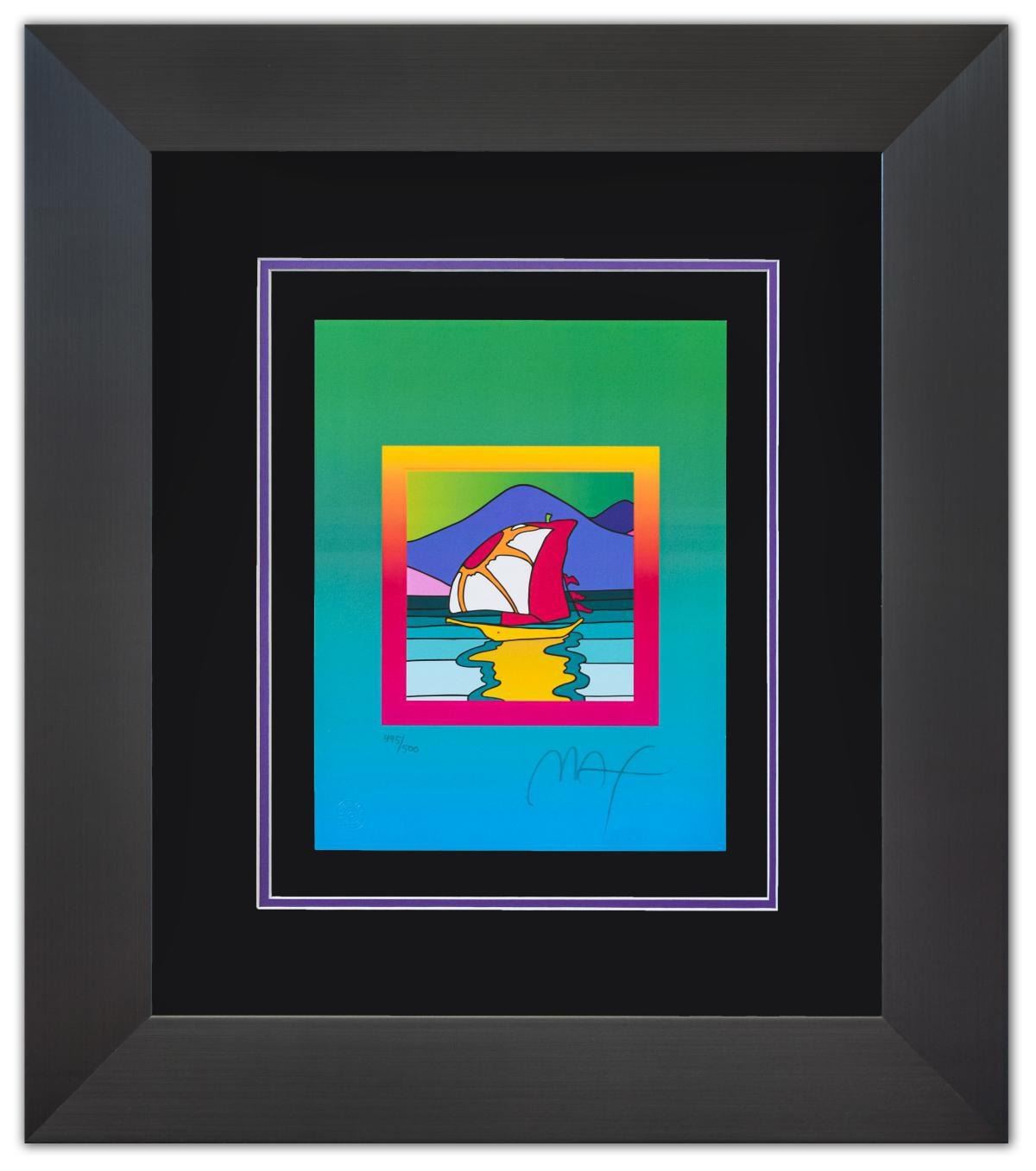 Artist: Peter Max. Medium: Original Lithograph. Title: Sailboat East on Blends Ver. II. Size (Unframed): 12" x 10". Measures approx. (Framed): 27" x 24". Certificate of Authenticity: From Peter Max Studio. Additional: Custom framed. Reference# 15494.