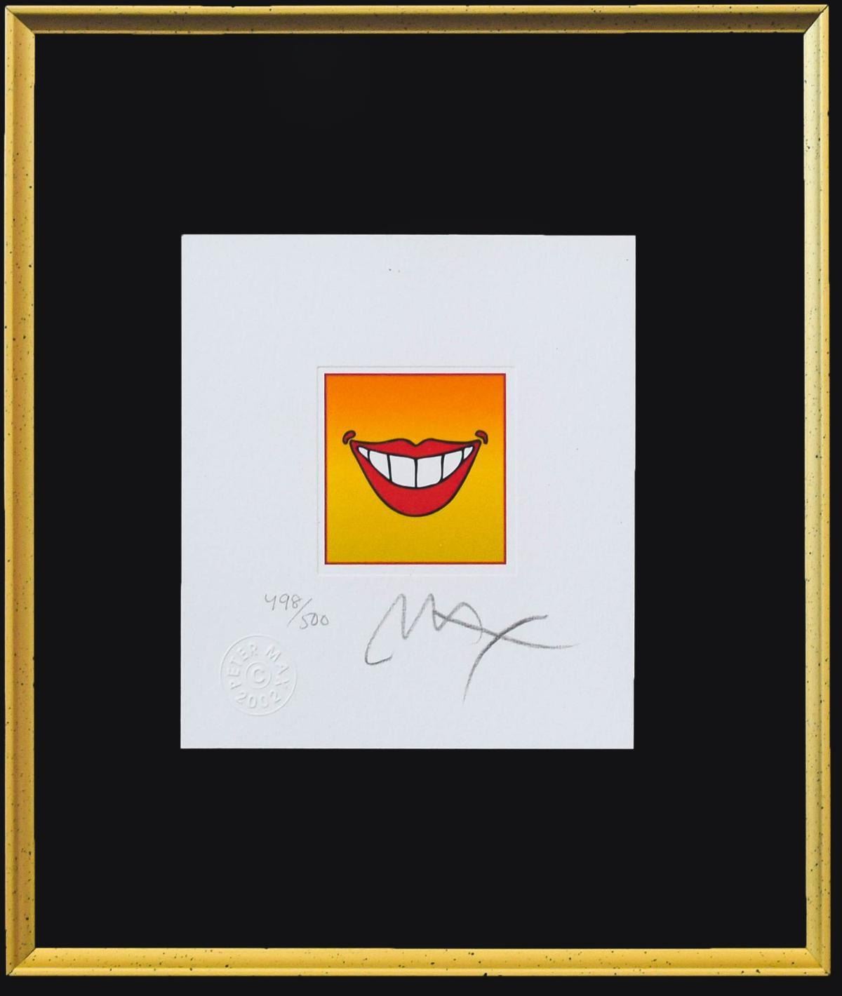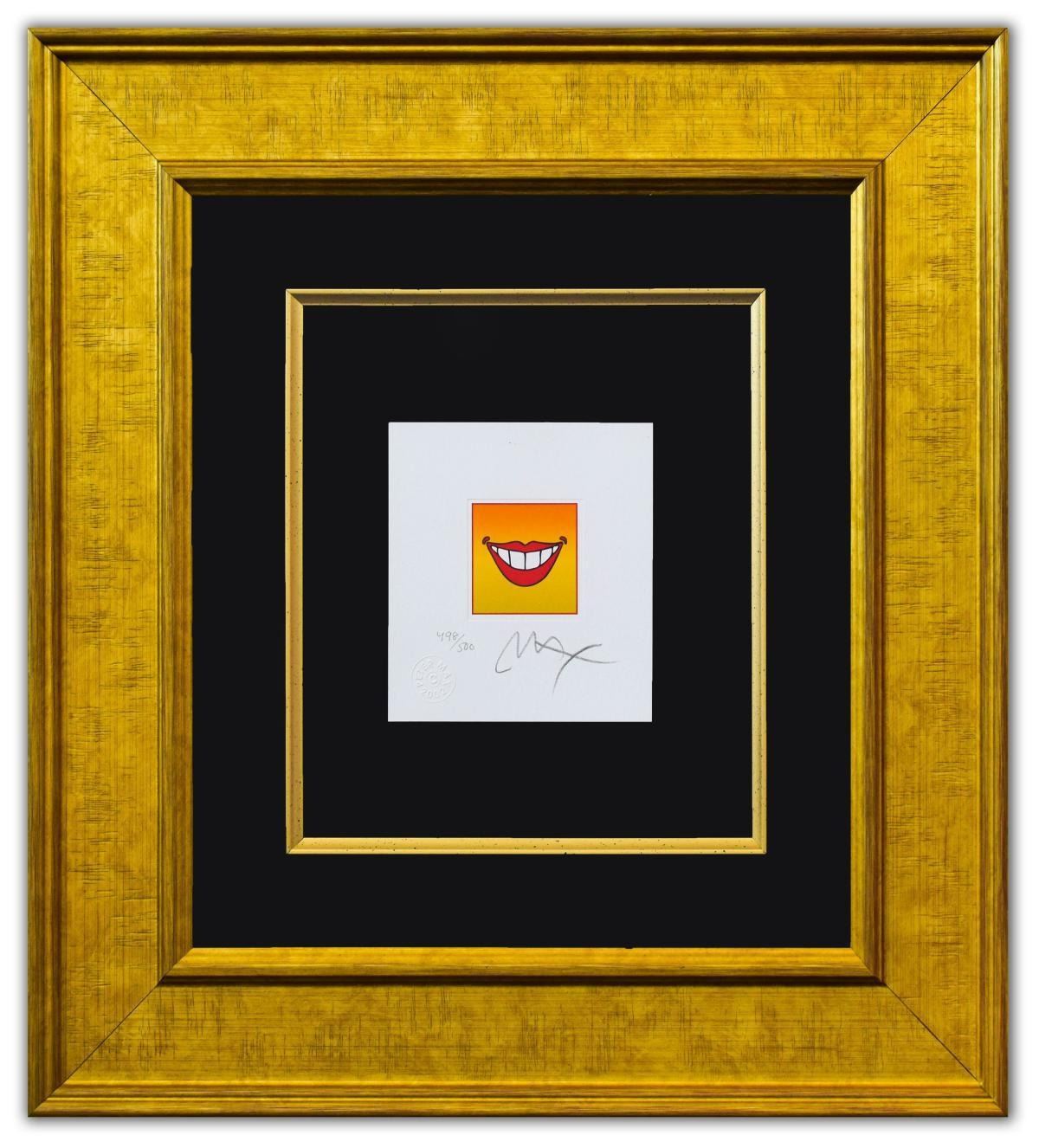 Artist: Peter Max. Medium: Original Lithograph. Title: Smile (Mini). Size (Unframed): 5" x 4.5". Size (Framed): 17.5" x 16.5". Certificate of Authenticity: From Peter Max Studio. Additional: Custom framed. Reference# 14771.