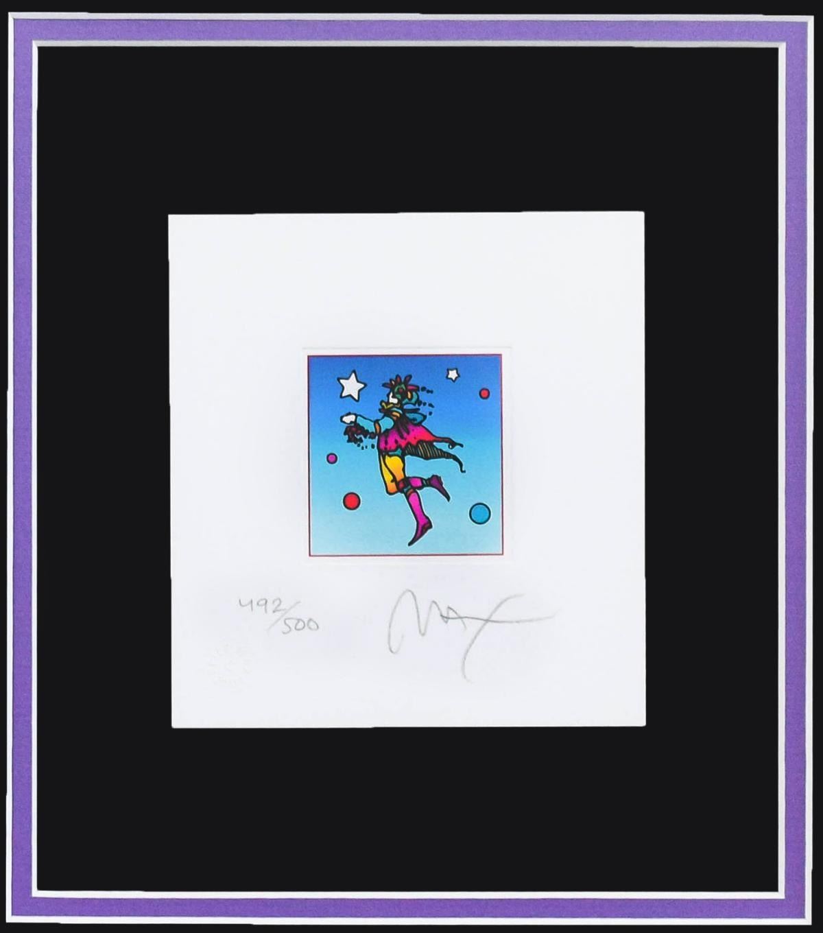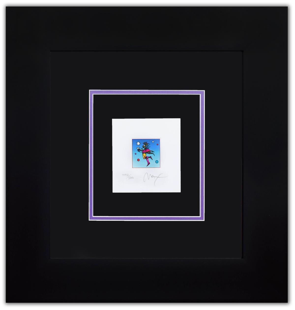 Artist: Peter Max. Medium: Original Lithograph. Title: Star Catcher on Blue. Size (Unframed): 5" x 4.5". Size (Framed): 19" x 18". Certificate of Authenticity: From Peter Max Studio. Additional: Custom framed. Reference# 15195.