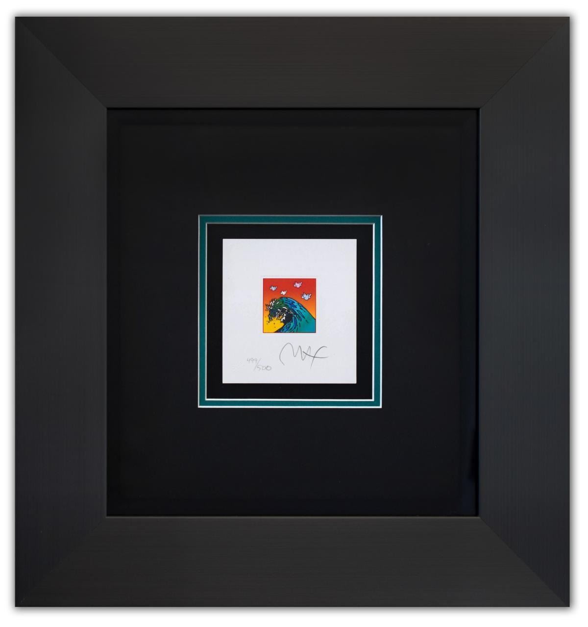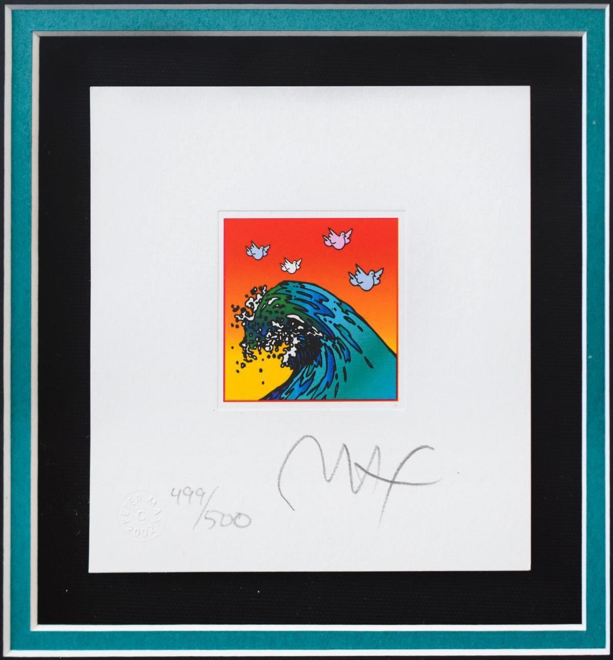 Artist: Peter Max. Medium: Original Lithograph. Title: The Great Wave with Doves (Mini). Size (Unframed): 4.5" x 4.5". Size (Framed): 20" x 19". Certificate of Authenticity: From Peter Max Studio. Additional: Custom framed. Reference# 14106.