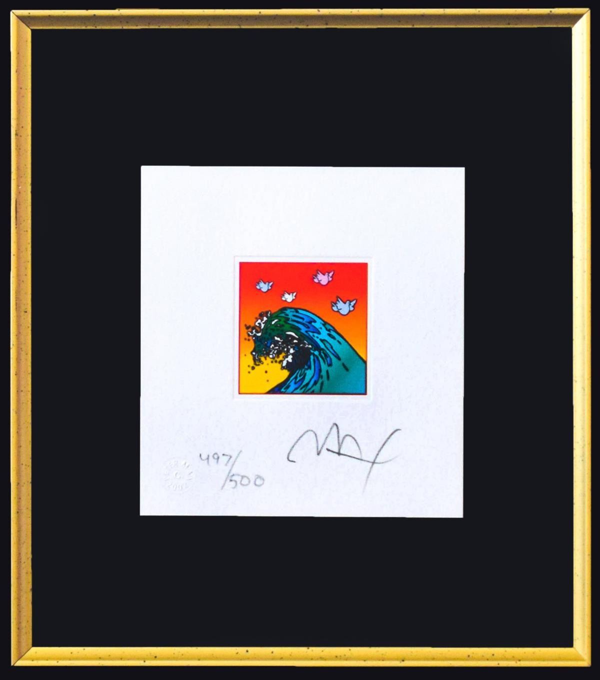 Artist: Peter Max. Medium: Original Lithograph. Title: The Great Wave with Doves (Mini). Size (Unframed): 4.5" x 5". Measures approx. (Framed): 16.5" x 17.5". Certificate of Authenticity: From Peter Max Studio. Additional: Custom framed. Reference# 14633.