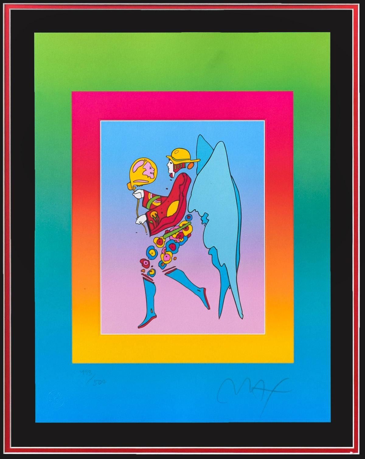 Artist: Peter Max. Medium: Original Lithograph. Title: Tip Toe Floating on Blends II. Size (Unframed): 17" x 13". Size (Framed): 32" x 28". Certificate of Authenticity: From Peter Max Studio. Additional: Custom framed. Reference# 15858.