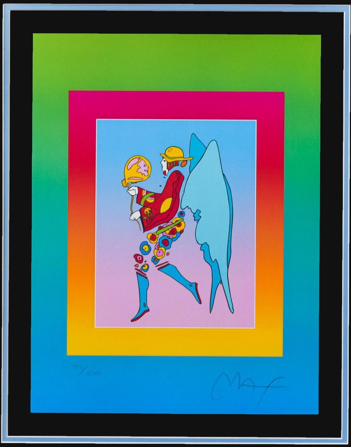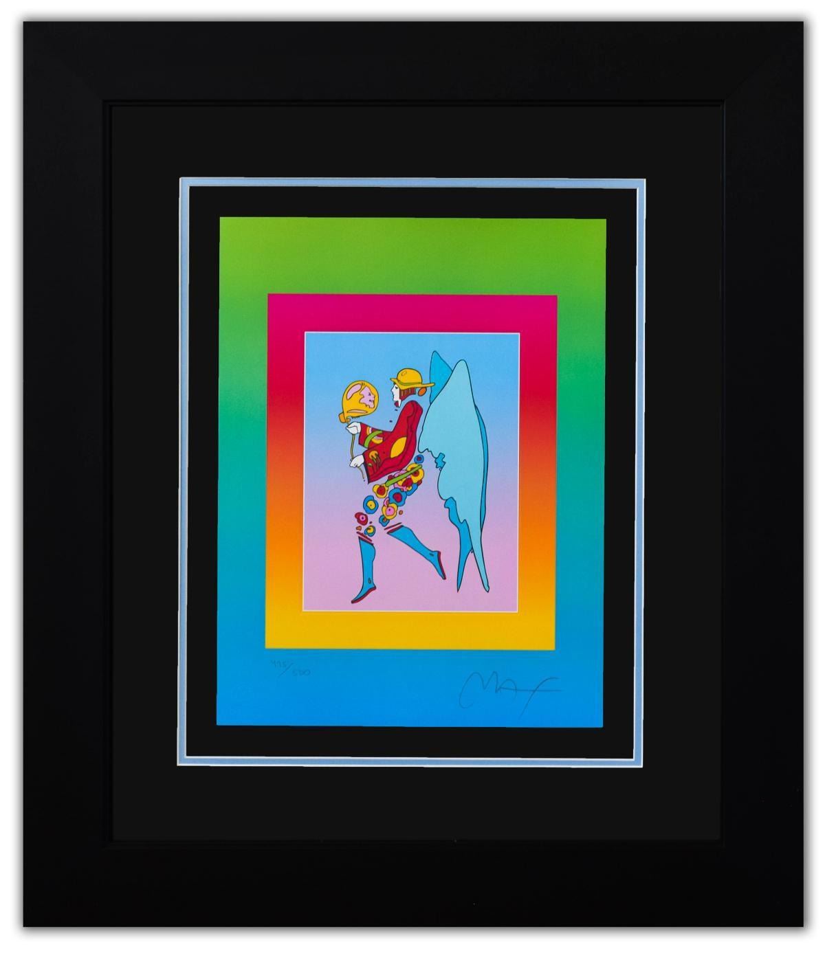 Artist: Peter Max. Medium: Original Lithograph. Title: Tip Toe Floating on Blends II. Size (Unframed): 17" x 13". Size (Framed): 29.5" x 25.5". Certificate of Authenticity: From Peter Max Studio. Additional: Custom framed. Reference# 15586.