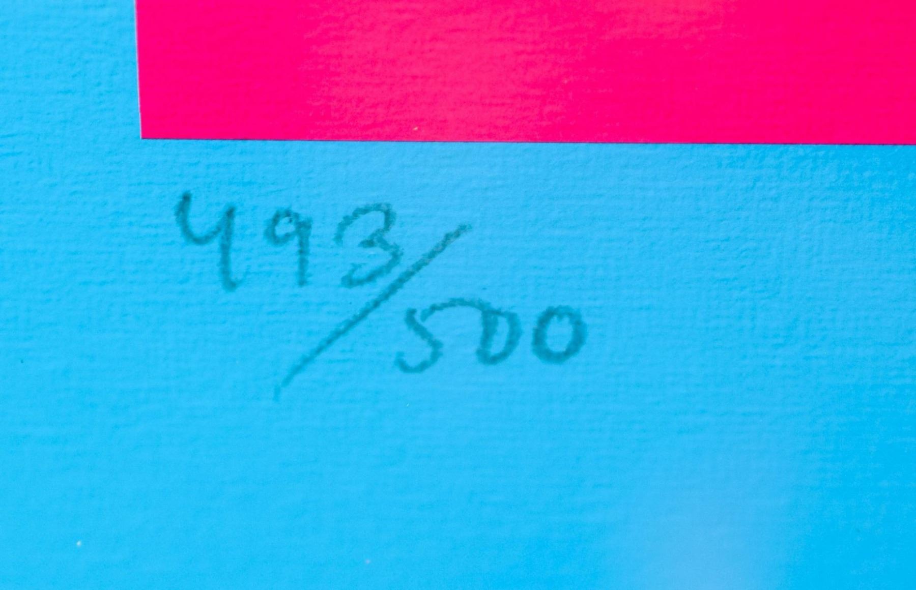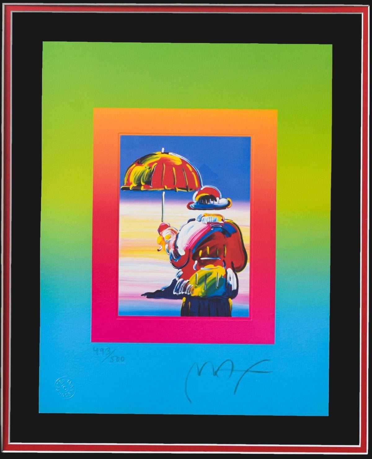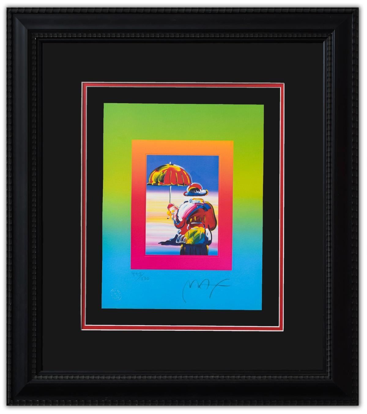 Artist: Peter Max. Medium: Original Lithograph. Title: UMBRELA MAN ON BLENDS. Size (Unframed): 12.5" x 10". Size (Framed): 24" x 21". Certificate of Authenticity: From Peter Max Studio. Additional: Custom framed. Reference# 15892.