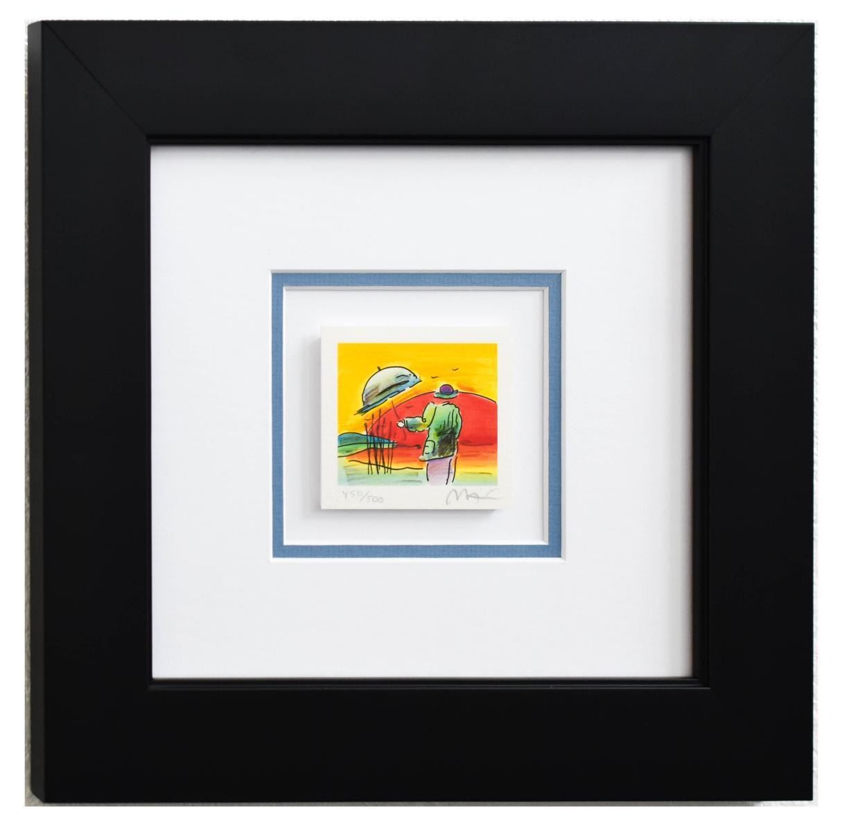 Artist: Peter Max. Medium: Original Lithograph. Title: Umbrella Man II (Mini Series). Size (Unframed): 2.5" x 3". Size (Framed): 11.5" x 12.5". Limited Edition: Numbered 450/500. Certificate of Authenticity: From Peter Max Studio. Additional: Custom framed. Reference# 11747.