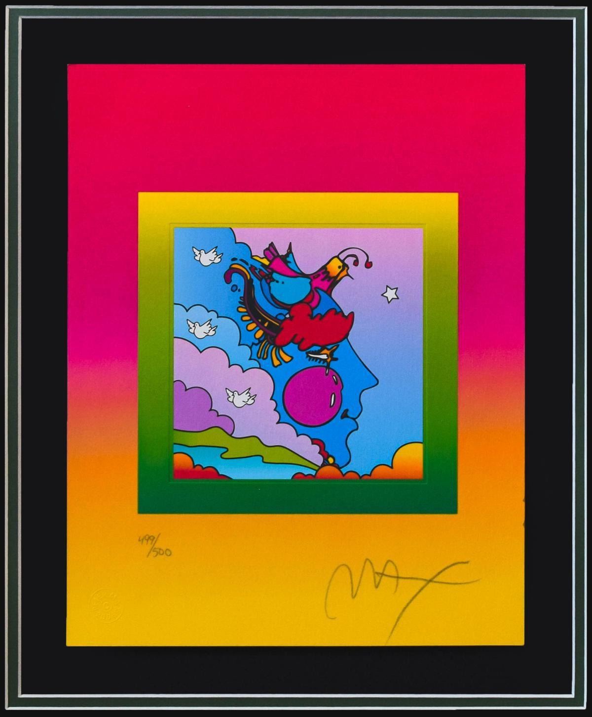 Artist: Peter Max. Medium: Original Lithograph. Title: Woodstock Profile on Blends. Size (Unframed): 12.5" x 10". Size (Framed): 25" x 22". Certificate of Authenticity: From Peter Max Studio. Additional: Custom framed. Reference# 14696.