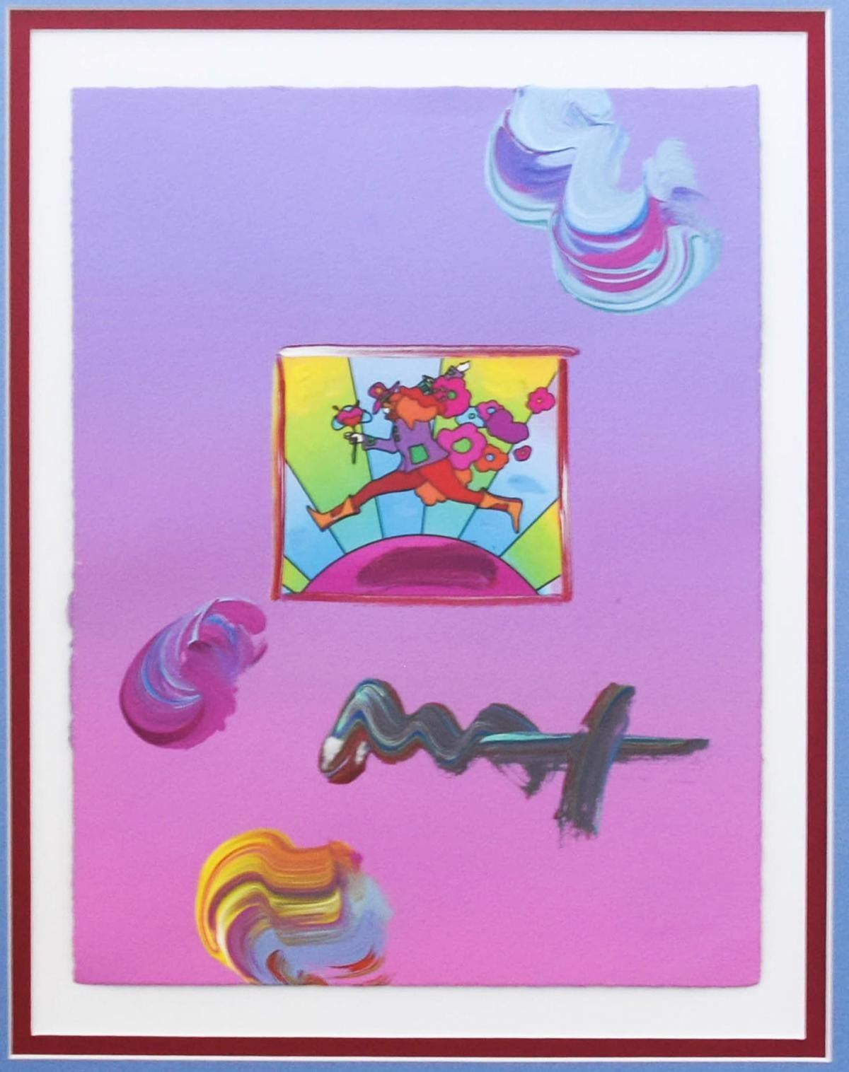 Artist: Peter Max. Medium: Original Mixed Media. Title: Flower Jumper Over Sunrise 2006 Ver. I #102. Size (Unframed): 11" x 8.5". Size (Framed): 21.5" x 18.5". Certificate of Authenticity: From Peter Max Studio. Additional: Custom Framed. Catalogue#: 188215. Reference# 12698.