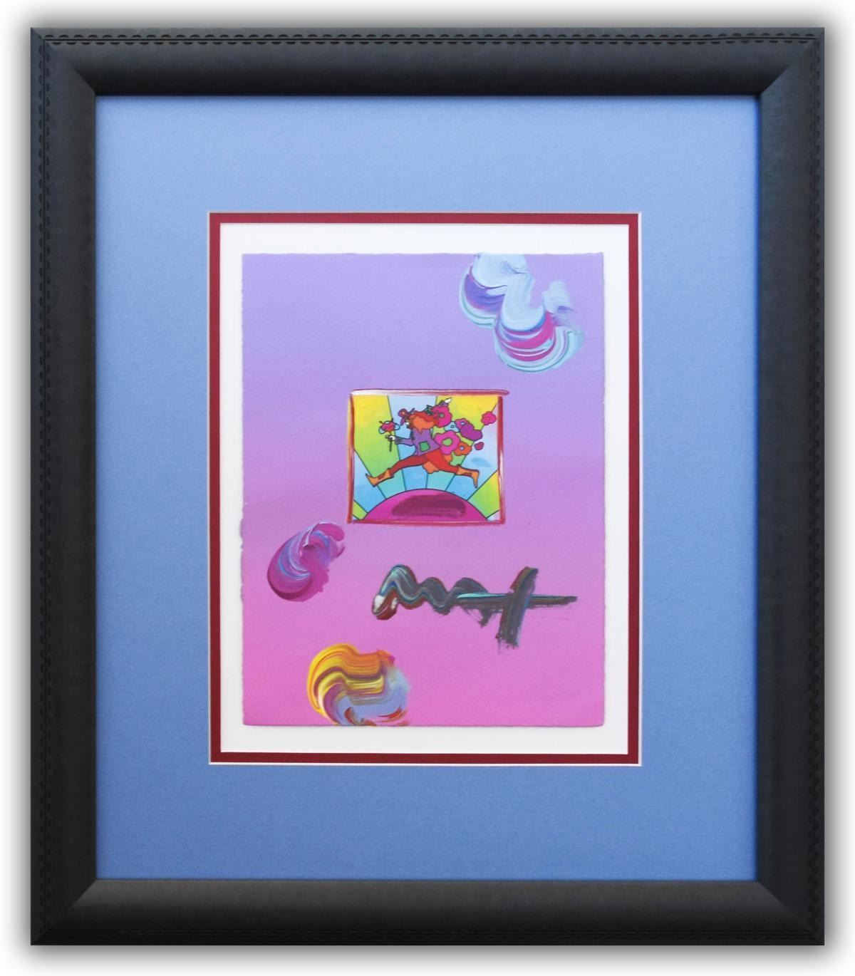 Artist: Peter Max. Medium: Original Mixed Media. Title: Flower Jumper Over Sunrise 2006 Ver. I #102. Size (Unframed): 11" x 8.5". Size (Framed): 21.5" x 18.5". Certificate of Authenticity: From Peter Max Studio. Additional: Custom Framed. Catalogue#: 188215. Reference# 12698.