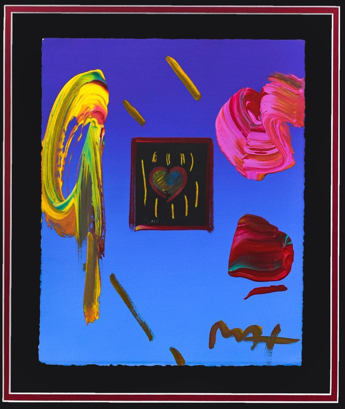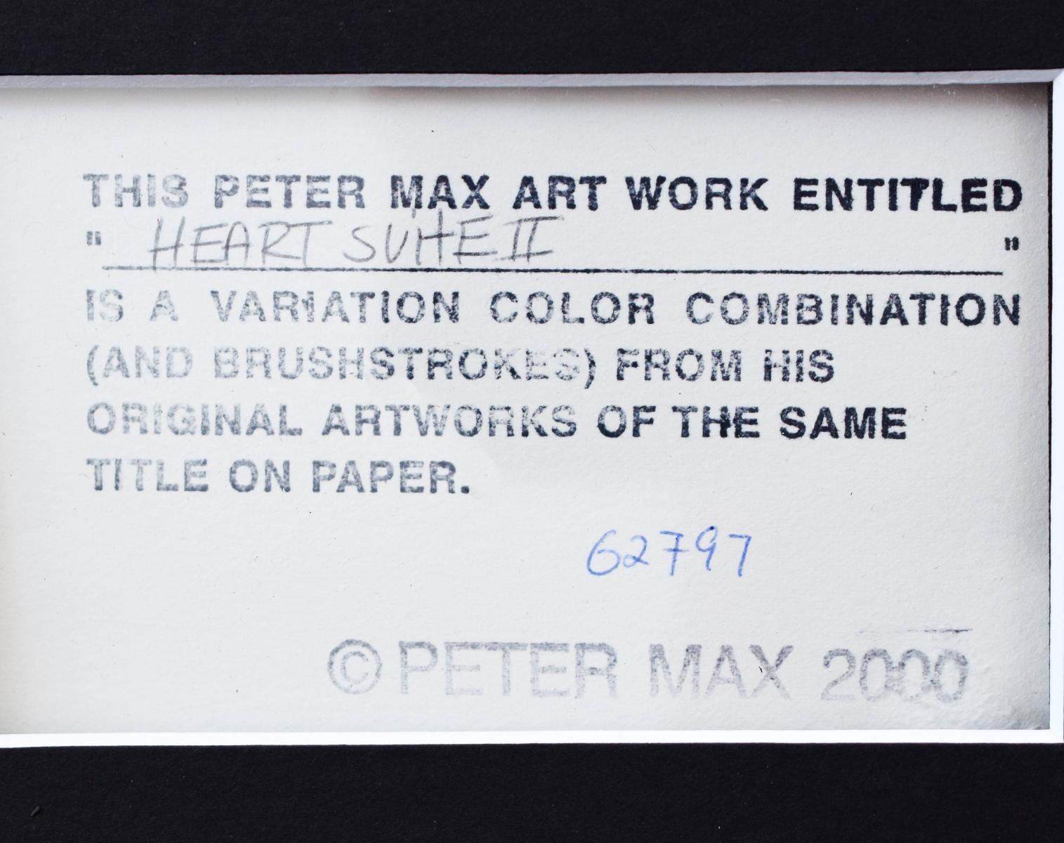Artist: Peter Max. Medium: Original Mixed Media. Title: Heart Suite II. Size (Unframed): 11" x 9". Size (Framed): 24" x 22". Certificate of Authenticity: From Peter Max Studio. Additional: Custom framed. Reference# 15420.