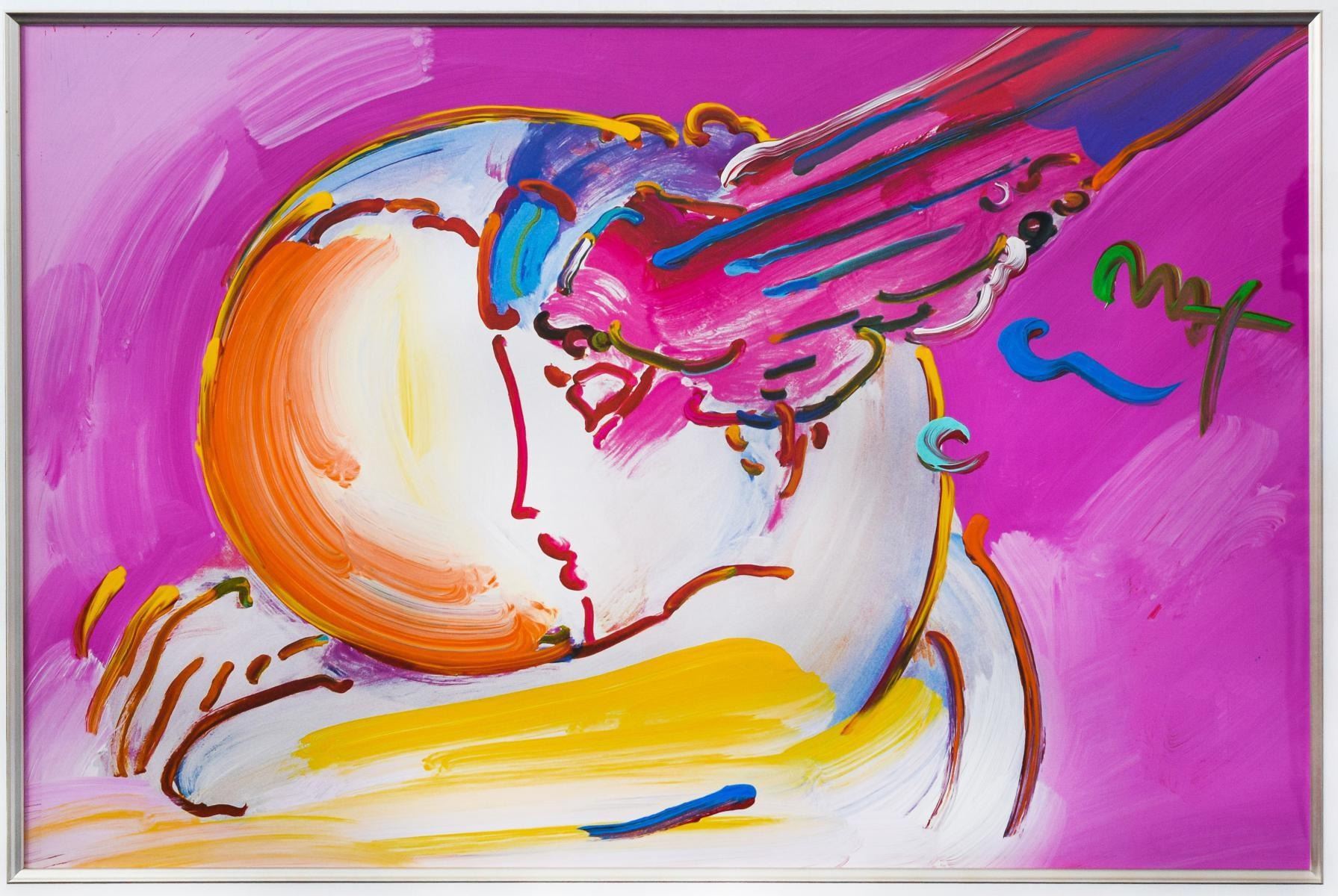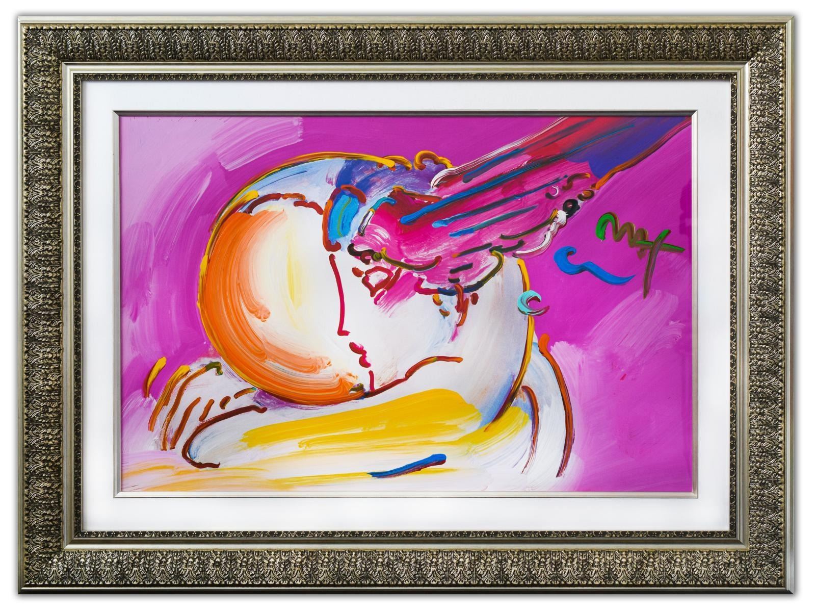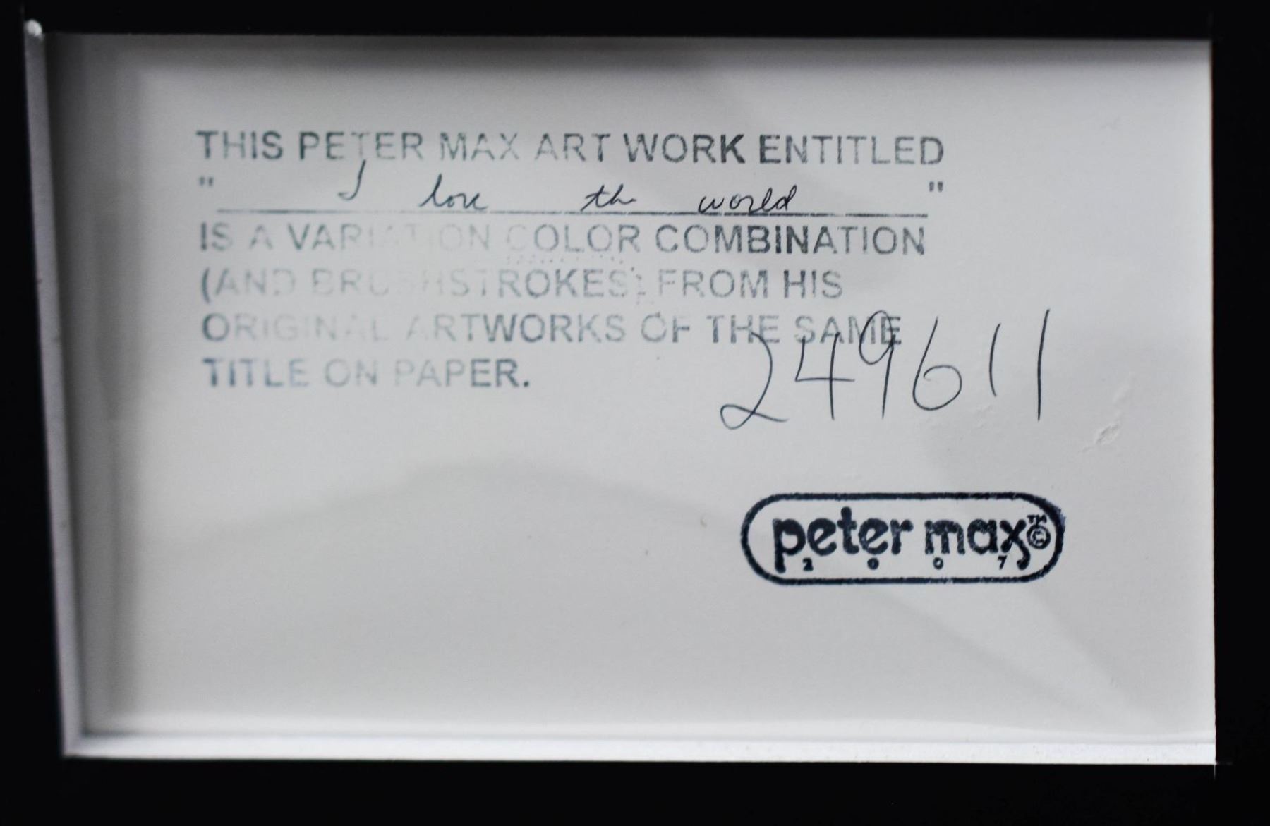 Artist: Peter Max. Medium: Original Mixed Media. Title: I Love the World. Size (Unframed): 24" x 36". Size (Framed): 36" x 47". Certificate of Authenticity: From Peter Max Studio. Additional: Custom framed. Reference# 14350.