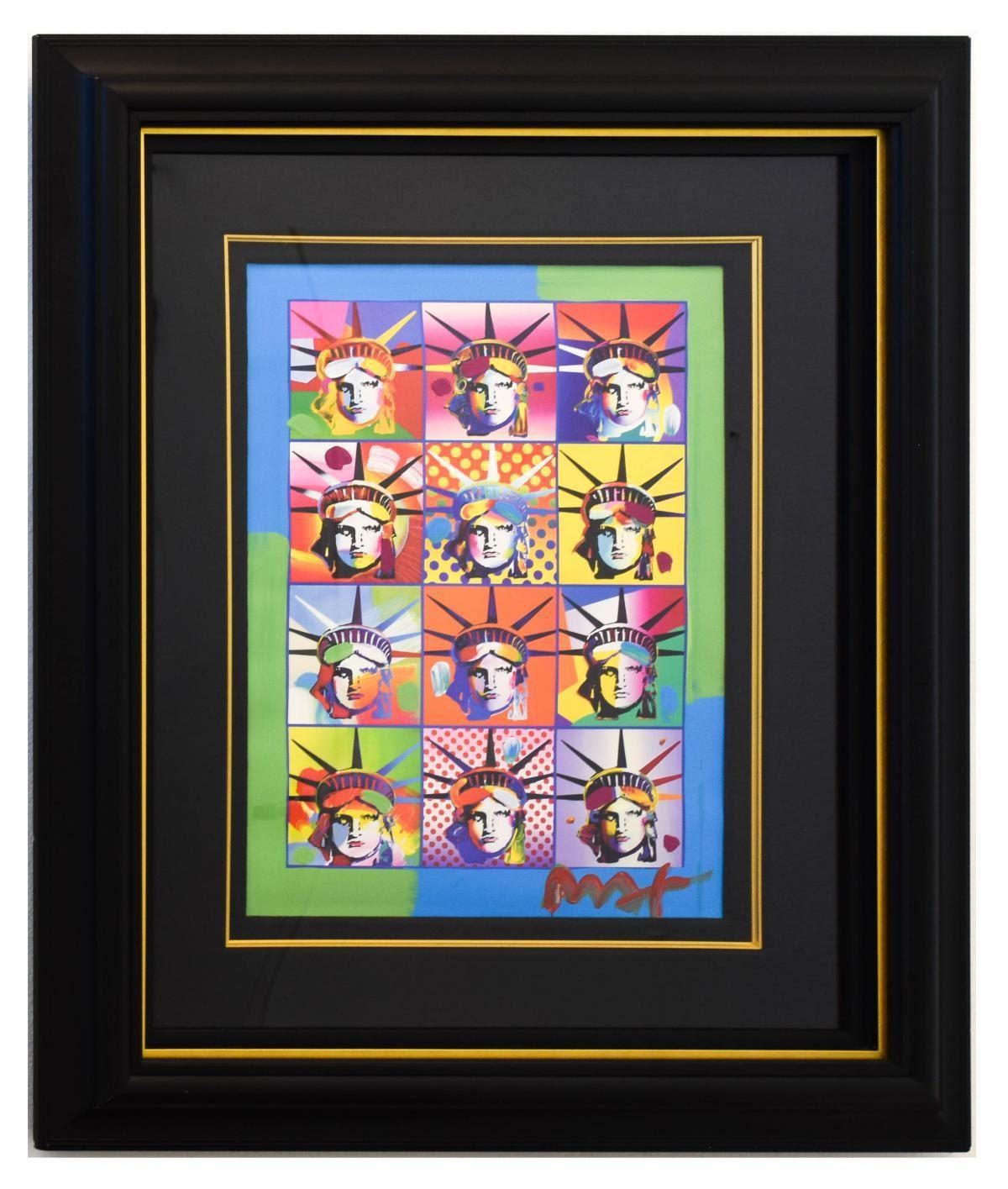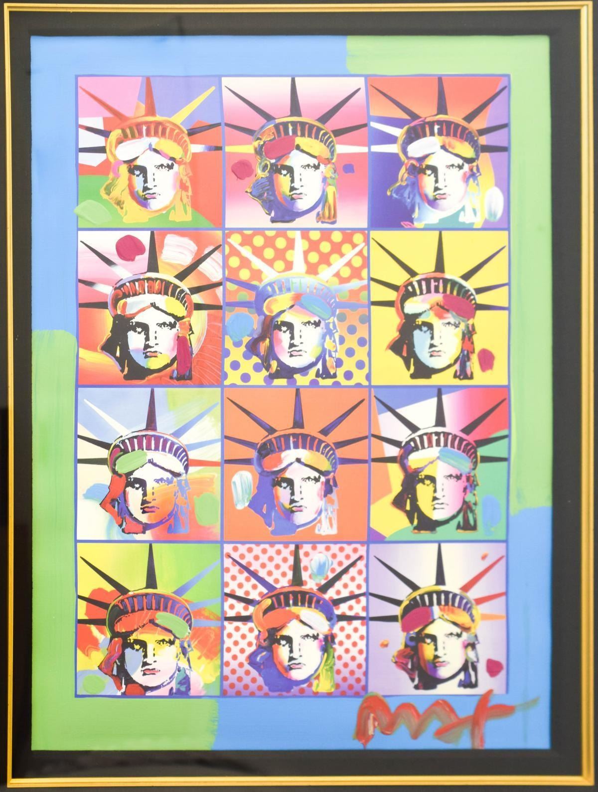 Artist: Peter Max. Medium: Original Mixed Media. Title: Liberty and Justice For All II. Size (Unframed): 24" x 18". Size (Framed): 39.5" x 33". Certificate of Authenticity: From Park West Gallery. Additional: Certificate of authneticity and appraisal from park West is included. Appraised Value: $14,500. Reference# 11941.