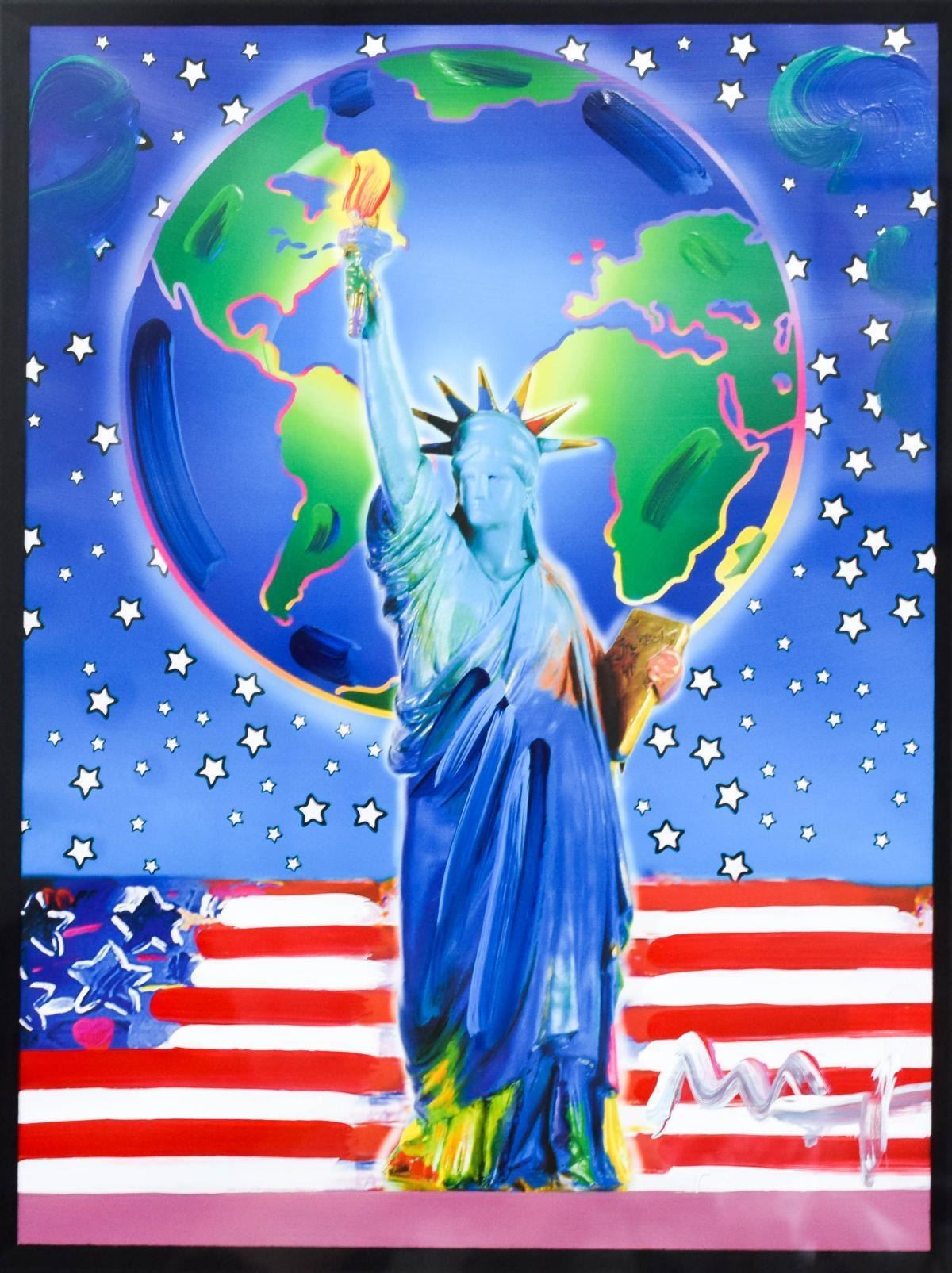 Artist: Peter Max. Medium: Original Mixed Media. Title: Peace On Earth. Size (Unframed): 24" x 18". Size (Framed): 39" x 34". Certificate of Authenticity: Certificate of authenticity from Park West is included. Additional: Only one of a kind. Custom framed. Registration#: 118298. Please note: there is light wear on the frame.. Reference# 11832.