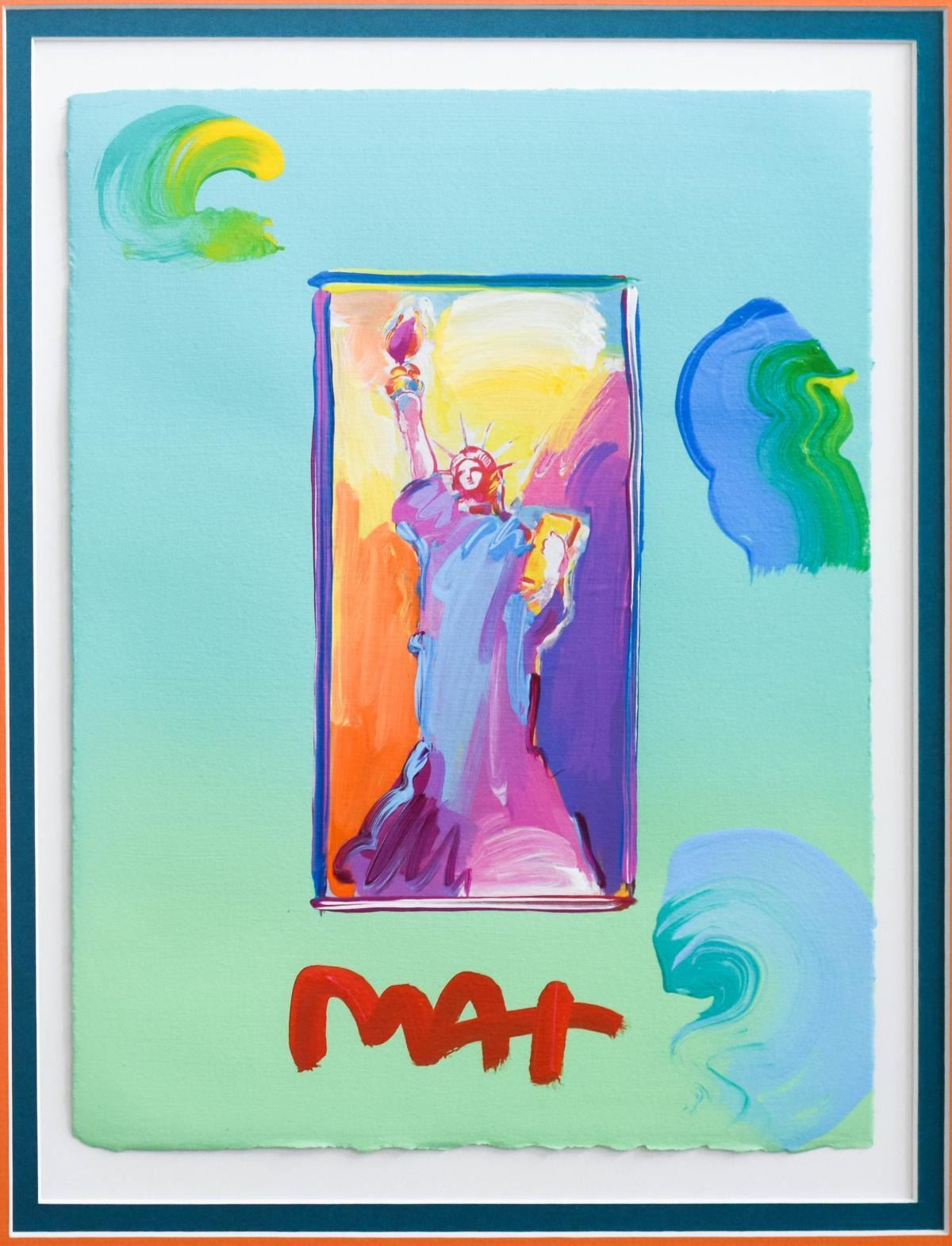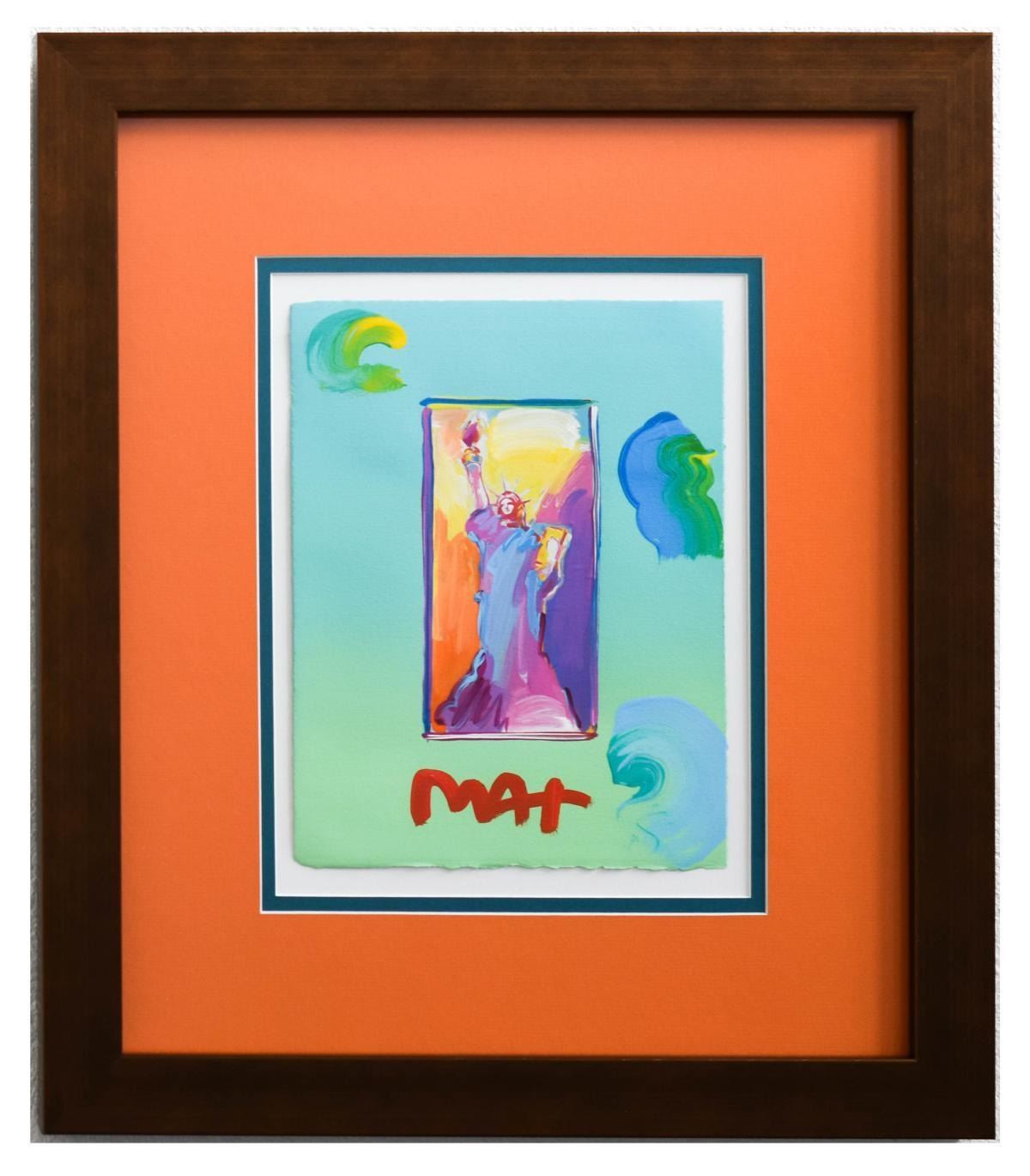 Artist: Peter Max. Medium: Original Mixed Media. Title: Statue of Liberty Ver. #147. Size (Unframed): 11" x 8.5". Size (Framed): 21.5" x 19". Certificate of Authenticity: From Peter Max Studio. Additional: Only one of a kind. Custom framed. Catalogue#: 412249. Reference# 11779.