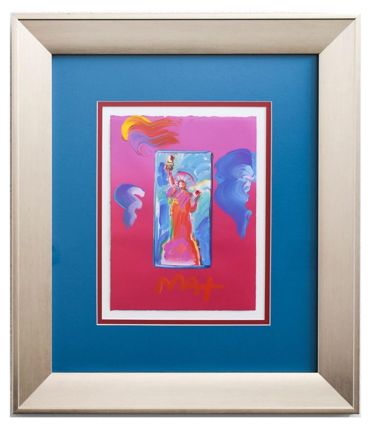 Artist: Peter Max. Medium: Original Mixed Media. Title: Statue of Liberty Ver. #149. Size (Unframed): 11" x 8.5". Size (Framed): 23" x 20". Certificate of Authenticity: From Peter Max Studio. Additional: Only one of a kind. Custom framed. Catalogue#: 412251. Reference# 11765.