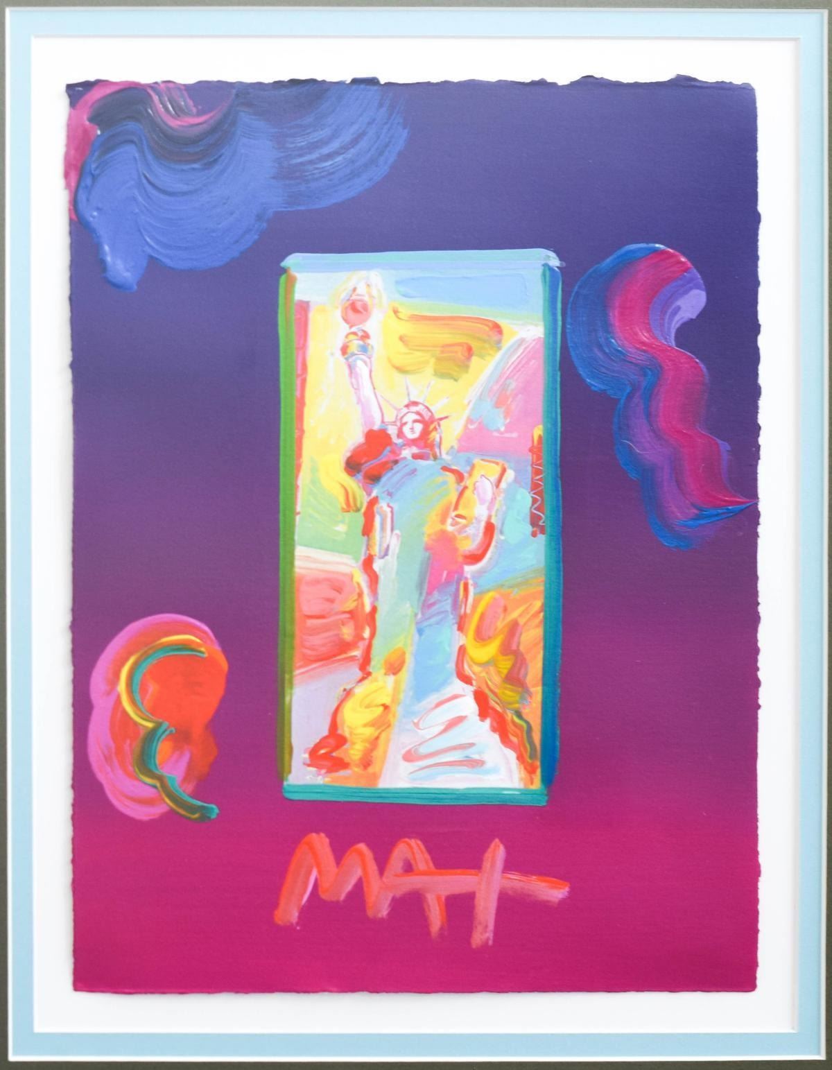 Artist: Peter Max. Medium: Original Mixed Media. Title: Statue of Liberty Ver. #162. Size (Unframed): 11" x 8.5". Size (Framed): 22" x 19.5". Certificate of Authenticity: From Peter Max Studio. Additional: Only one of a kind. Custom framed. Catalogue#: 412264. Reference# 11769.