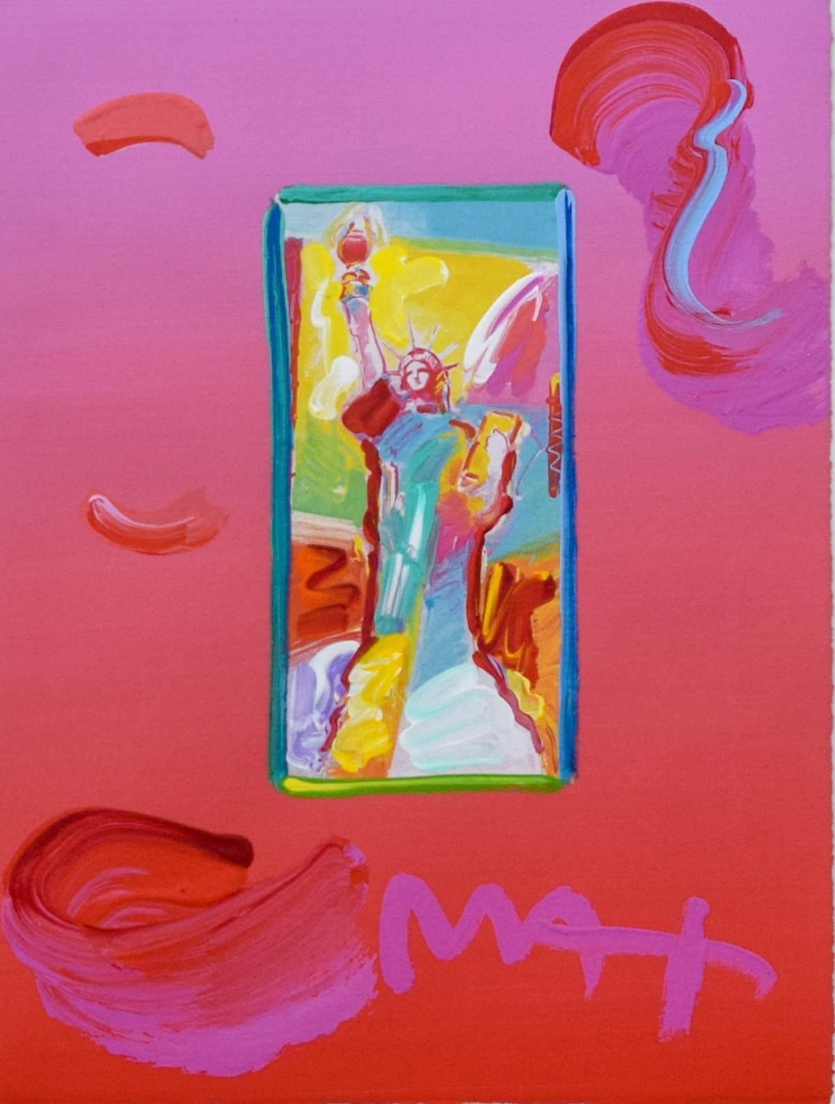 Artist: Peter Max. Medium: Original Mixed Media. Title: Statue of Liberty Ver. I #105. Size (Unframed): 11" x 8.5". Size (Framed): 21.5" x 19". Certificate of Authenticity: From Max Studios. Catalogue# 410708. Additional: Only one of a kind. Custom framed. . Reference# 11057.