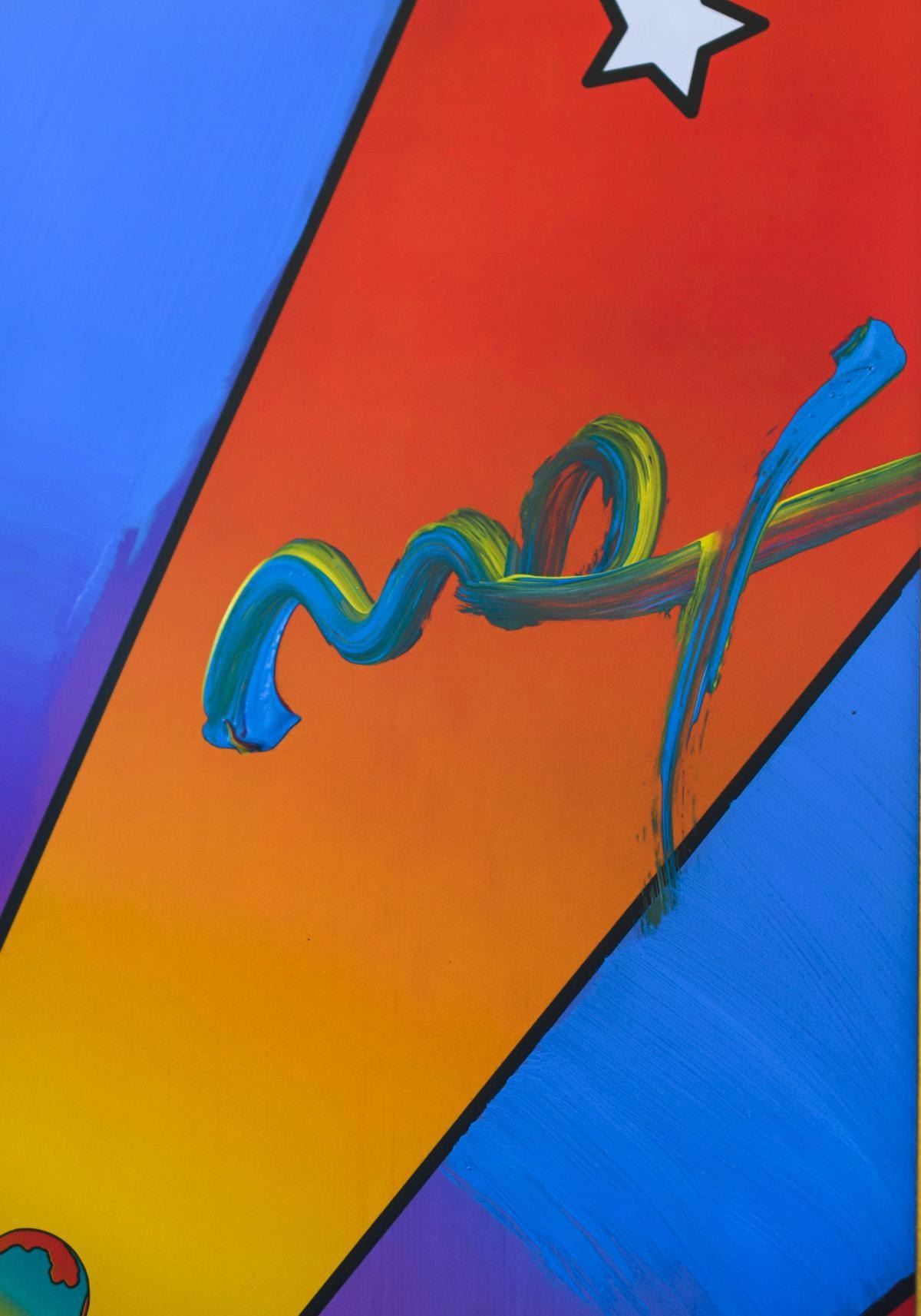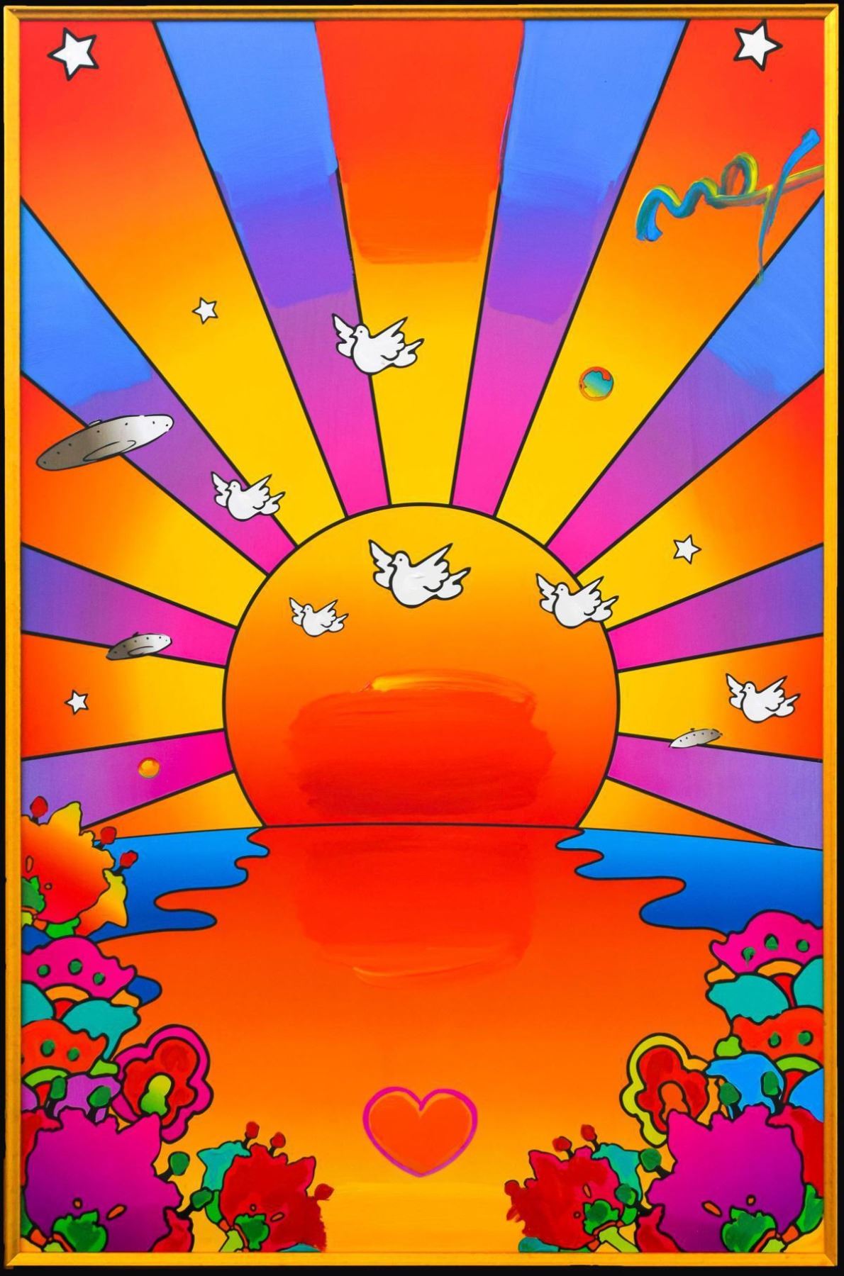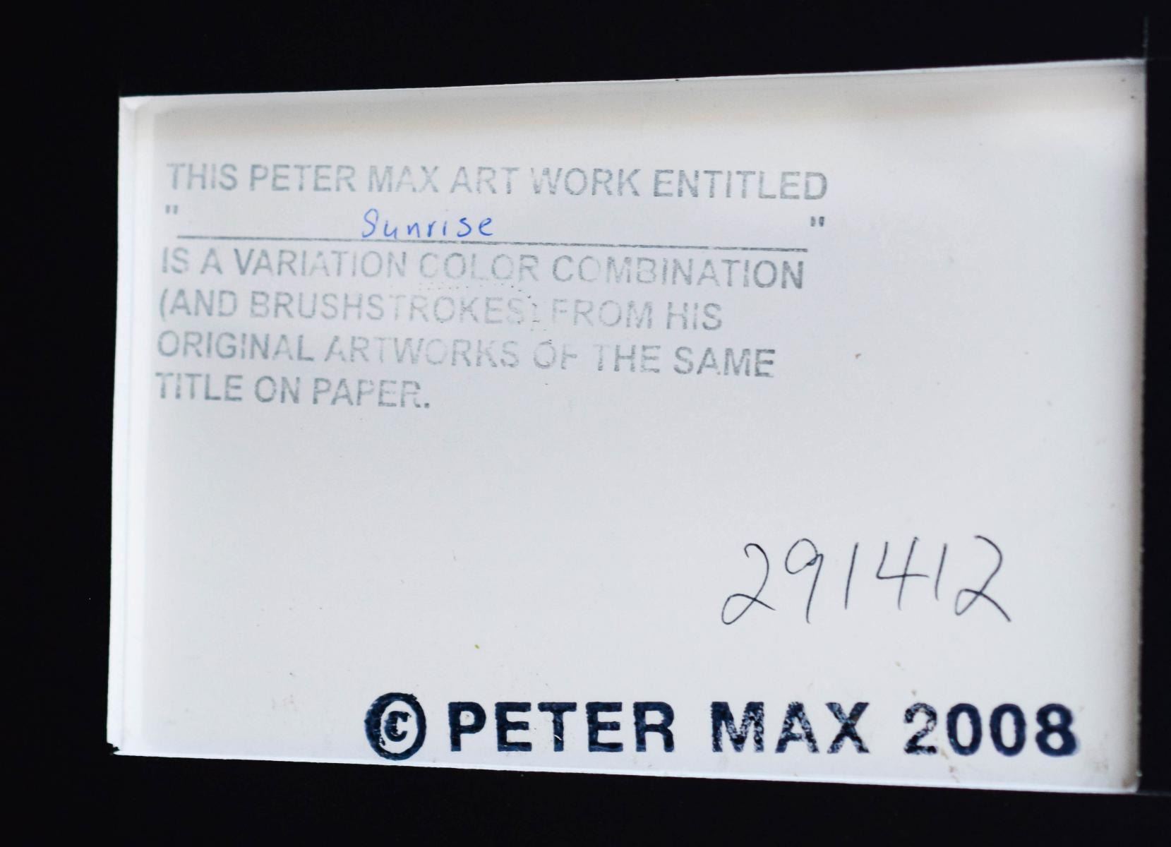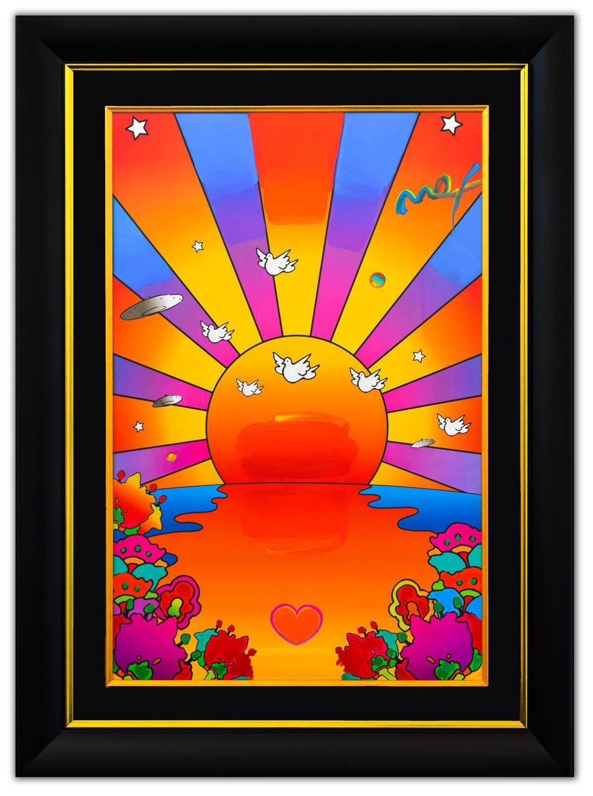 Artist: Peter Max. Medium: Original Mixed Media. Title: Sunrise. Size (Unframed): 36" x 24". Size (Framed): 47" x 35". Certificate of Authenticity: From Peter Max Studio. Additional: Custom framed. Reference# 14799.