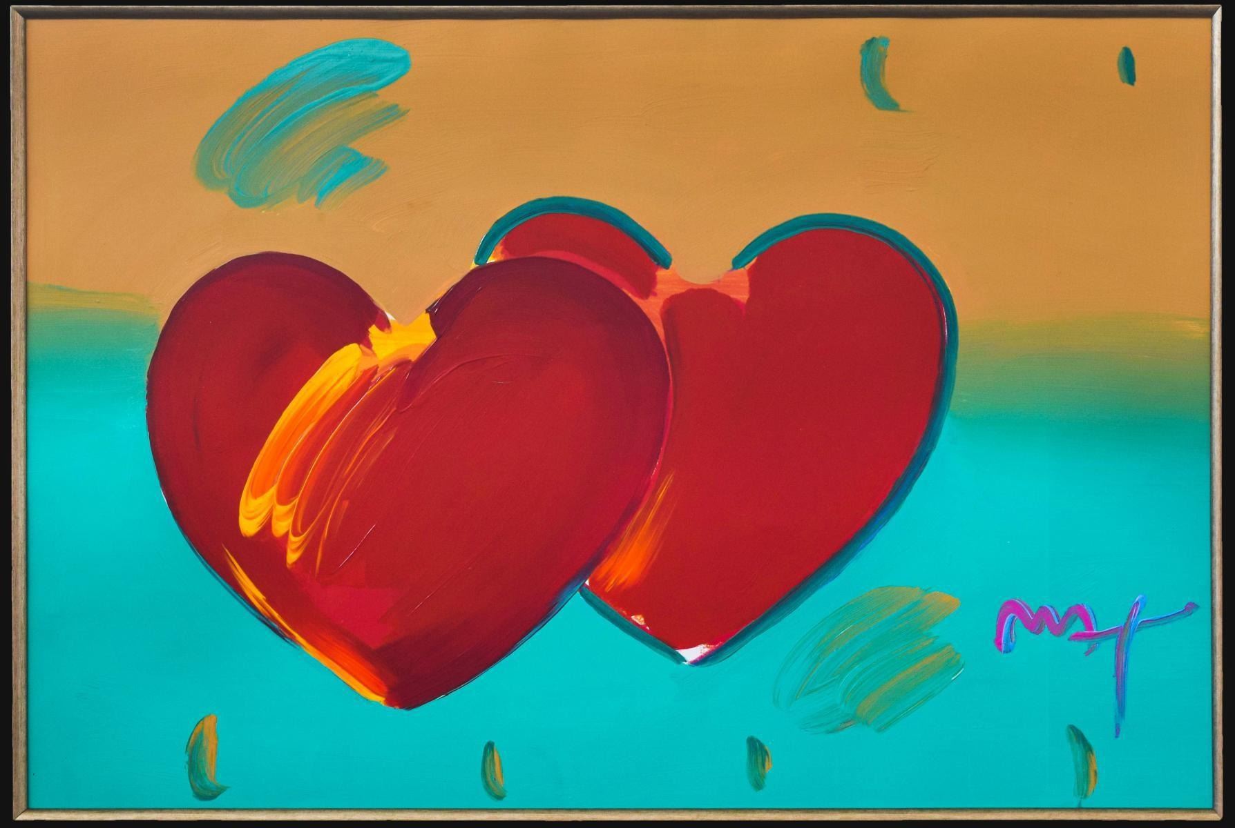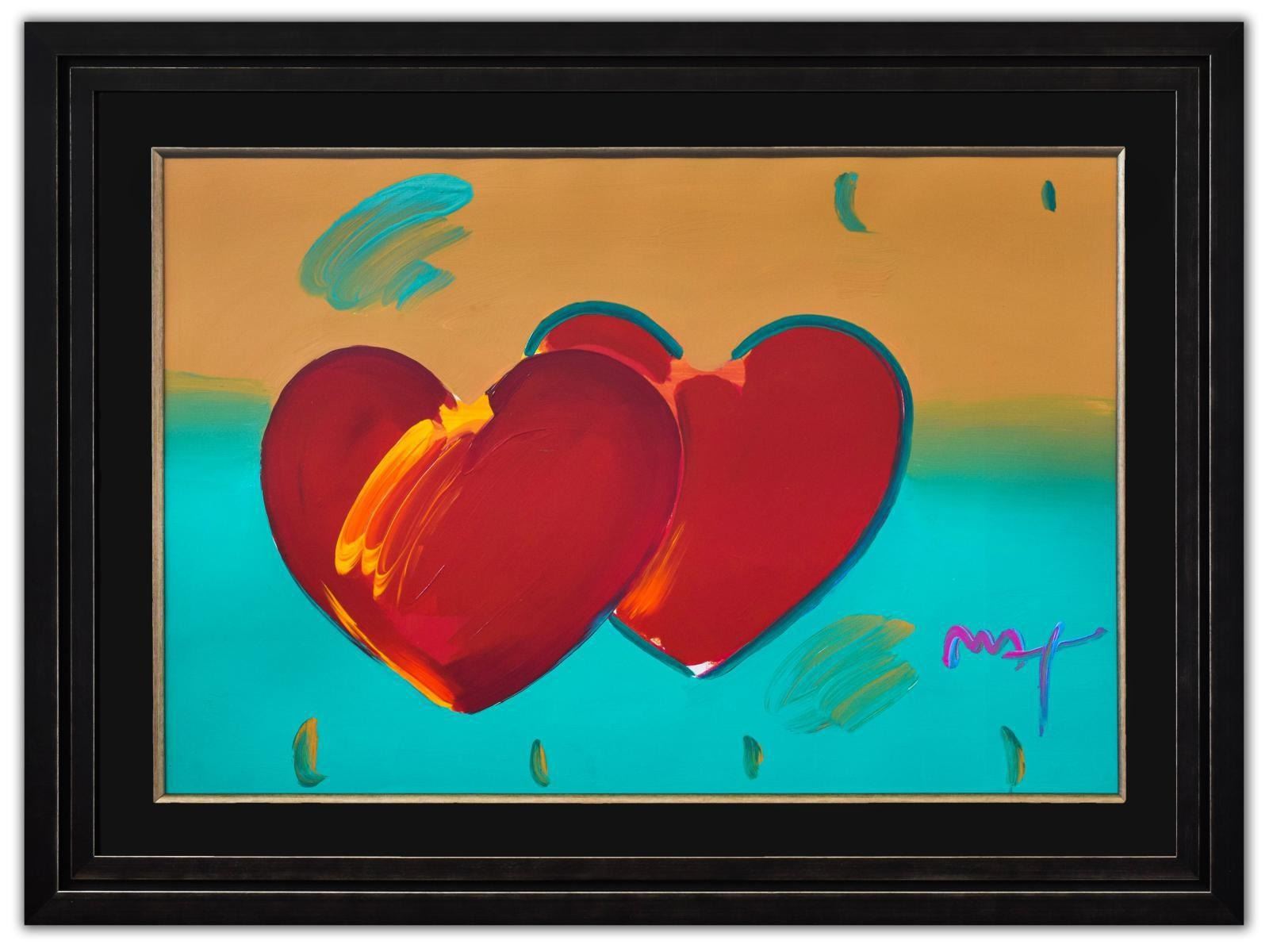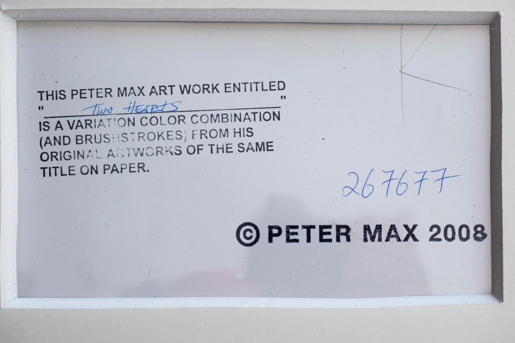 Artist: Peter Max. Medium: Original Mixed Media. Title: Two Hearts As One. Size (Unframed): 24" x 36". Size (Framed): 33" x 45". Certificate of Authenticity: From Peter Max Studio. Additional: Custom framed. Reference# 15202.