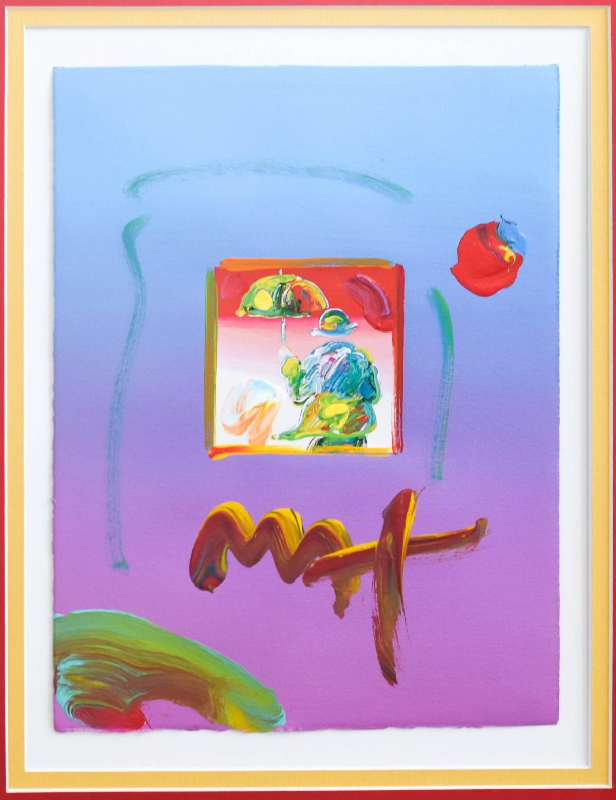 Artist: Peter Max. Medium: Original Mixed Media. Title: Umbrella Man 2005 Ver. I #297. Size (Unframed): 11" x 8.5". Size (Framed): 22" x 19.5". Certificate of Authenticity: From Peter Max Studio. Additional: Only one of a kind. Custom framed. Catalogue#: 158149. Reference# 11771.