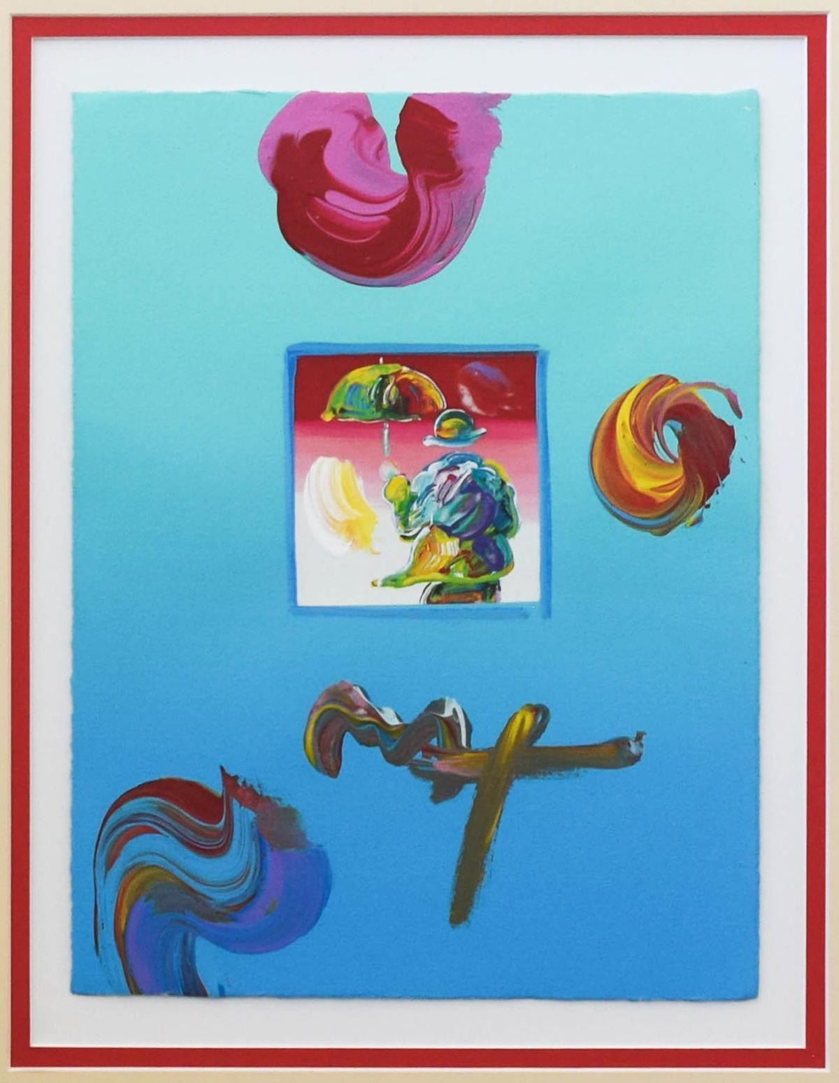 Artist: Peter Max. Medium: Original Mixed Media. Title: Umbrella Man 2006 Ver. I#74. Size (Unframed): 11" x 8.5". Size (Framed): 22.5" x 20". Certificate of Authenticity: From Peter Max Studio. Additional: Custom Framed. Catalogue#: 179514. Reference# 12701.