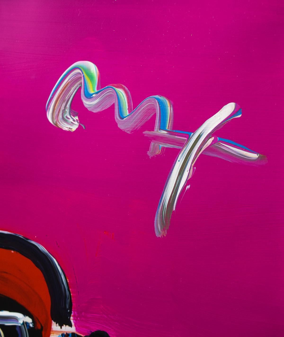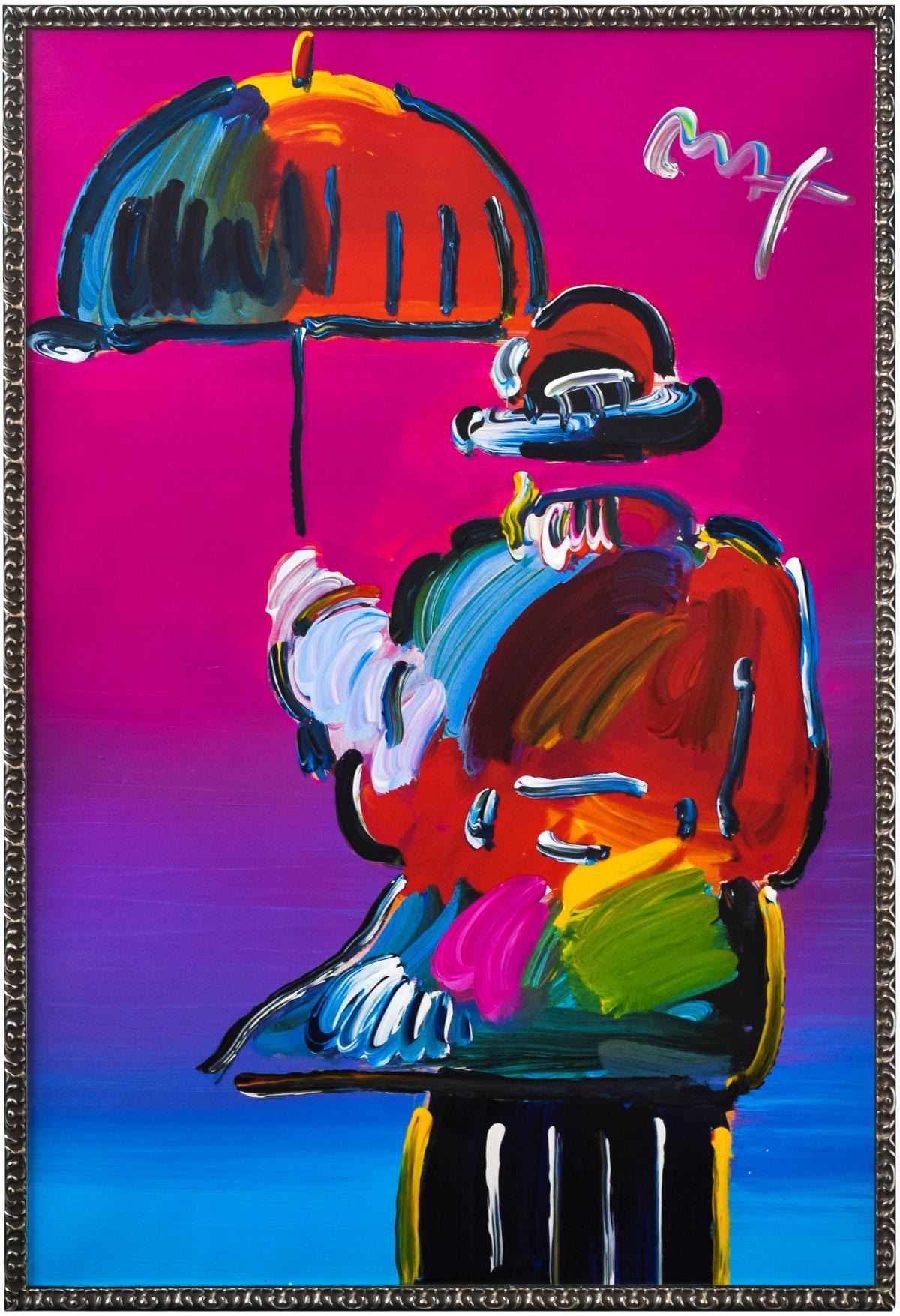 Artist: Peter Max. Medium: Original Mixed Media. Title: Umbrella Man. Size (Unframed): 36" x 24". Size (Framed): 44" x 36". Certificate of Authenticity: From Peter Max Studio. Additional: Custom framed. Reference# 15796.