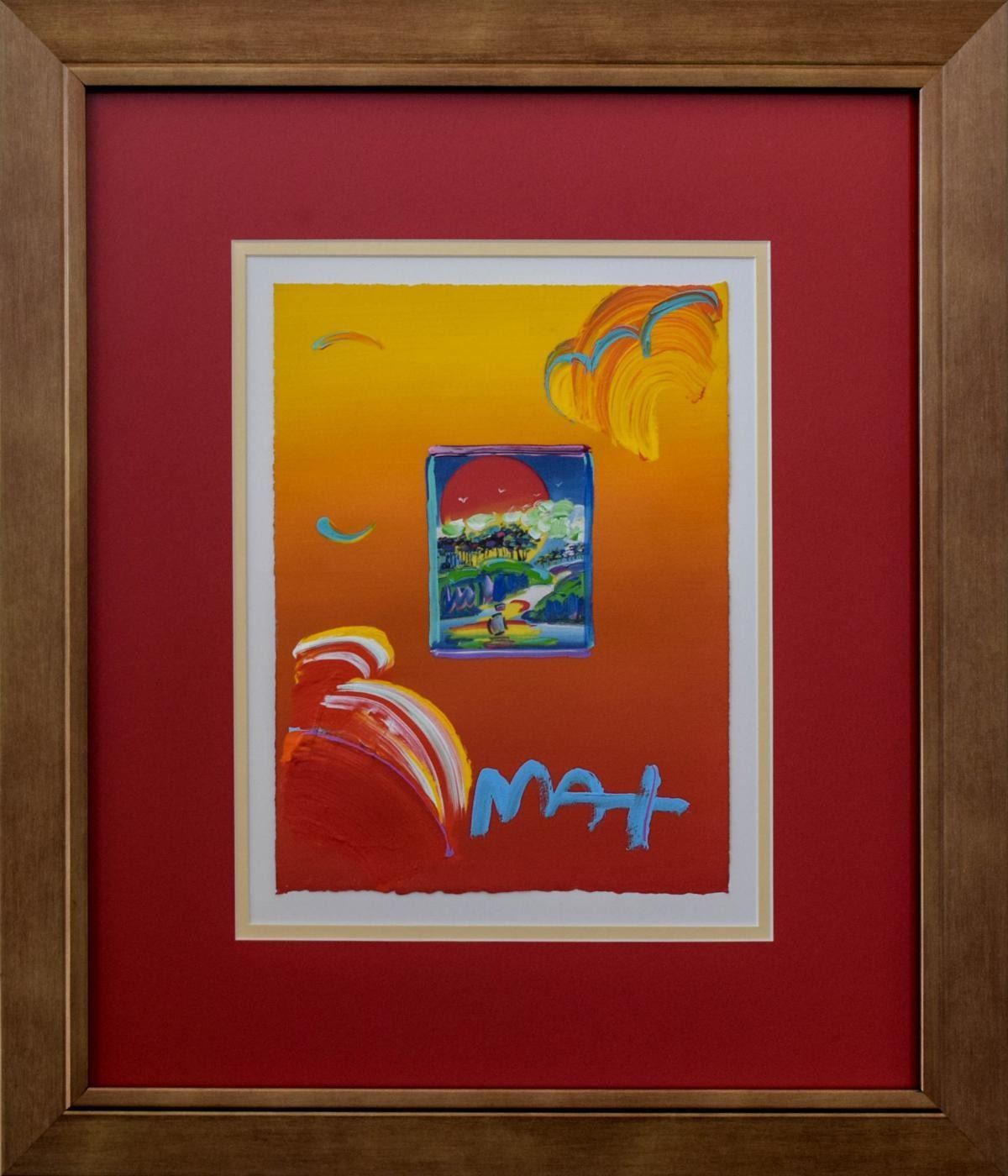 Artist: Peter Max. Medium: Original Mixed Media. Title: Without Borders. Size (Unframed): 11" x 8.5". Size (Framed): 21.5" x 19". Certificate of Authenticity: Is included. Additional: Only one of a kind. Custom framed. . Reference# 11056.