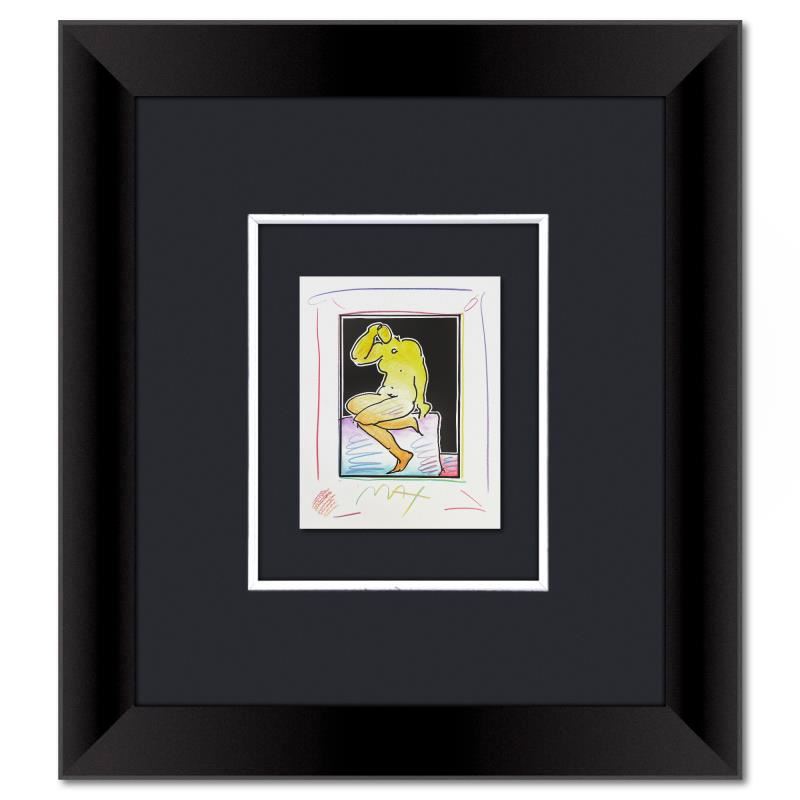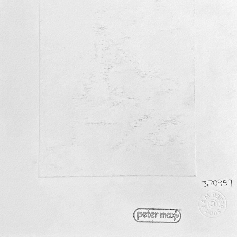 This is a one-of-a-kind mixed media on paper, hand signed by Peter Max. The piece comes custom framed with a backside cutout to display Peter Max Studio registration number 370957 certifying authenticity. Measures approximately 23" x 21" (frame), 9" x 7" (image).