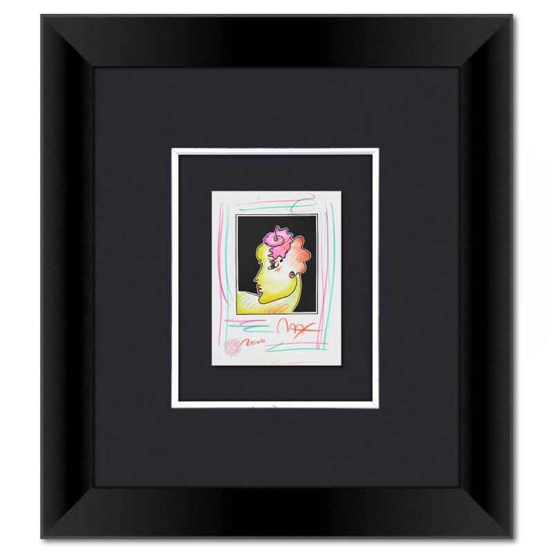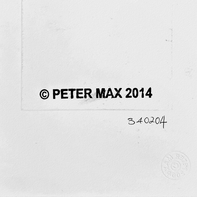 This is a one-of-a-kind mixed media on paper, hand signed by Peter Max. The piece comes custom framed with a backside cutout to display Peter Max Studio registration number 340204 certifying authenticity. Measures approximately 22.5" x 20" (frame), 8.5" x 6" (image).