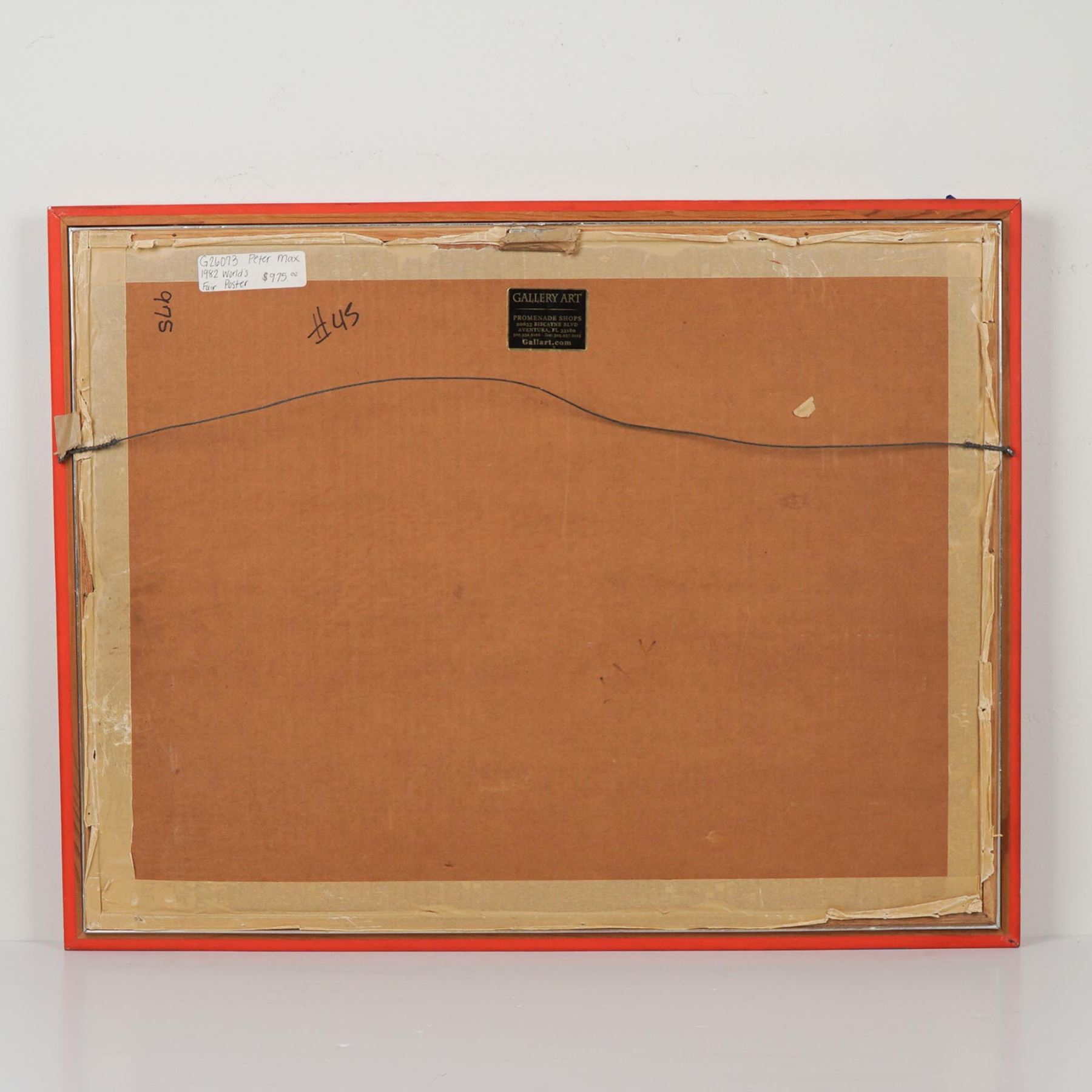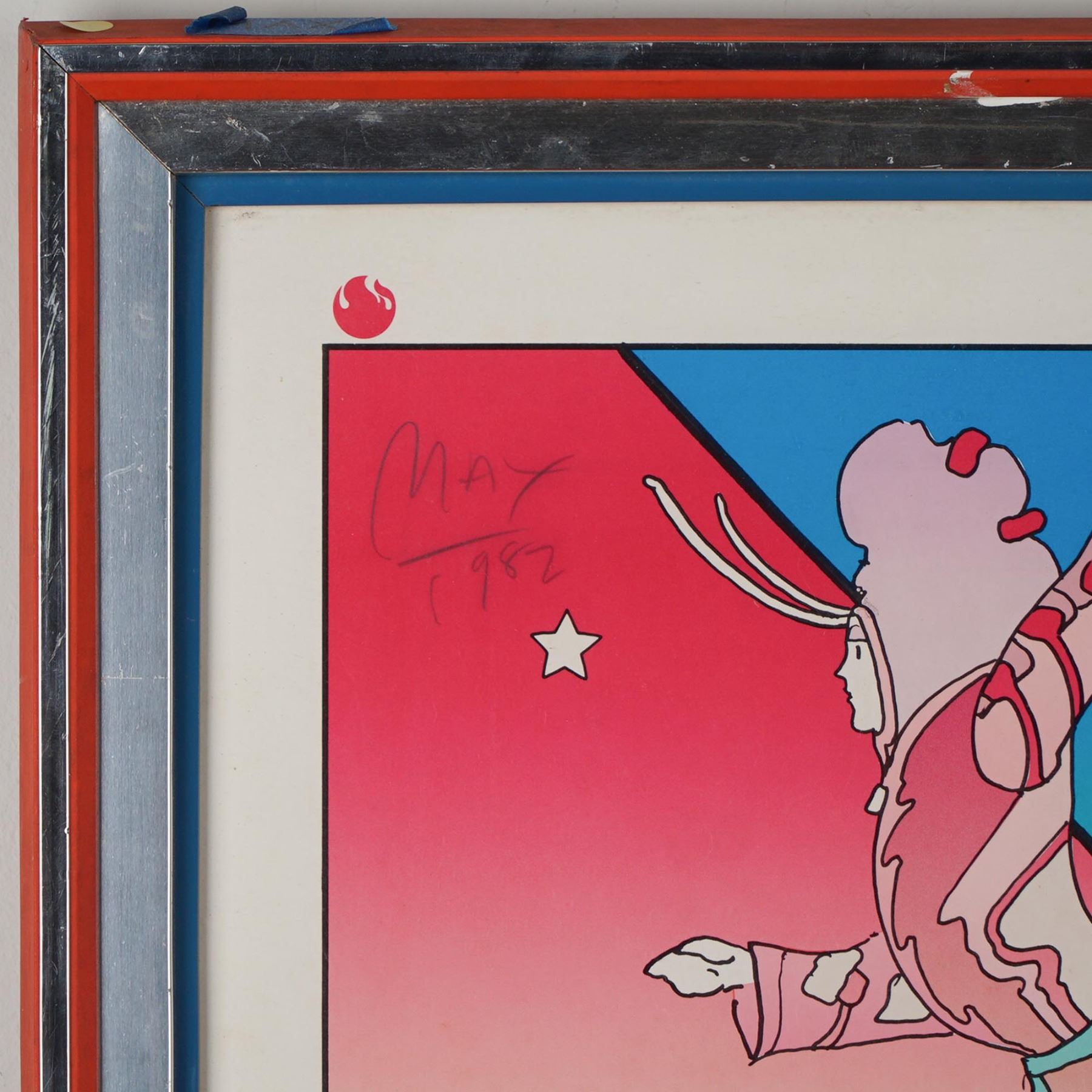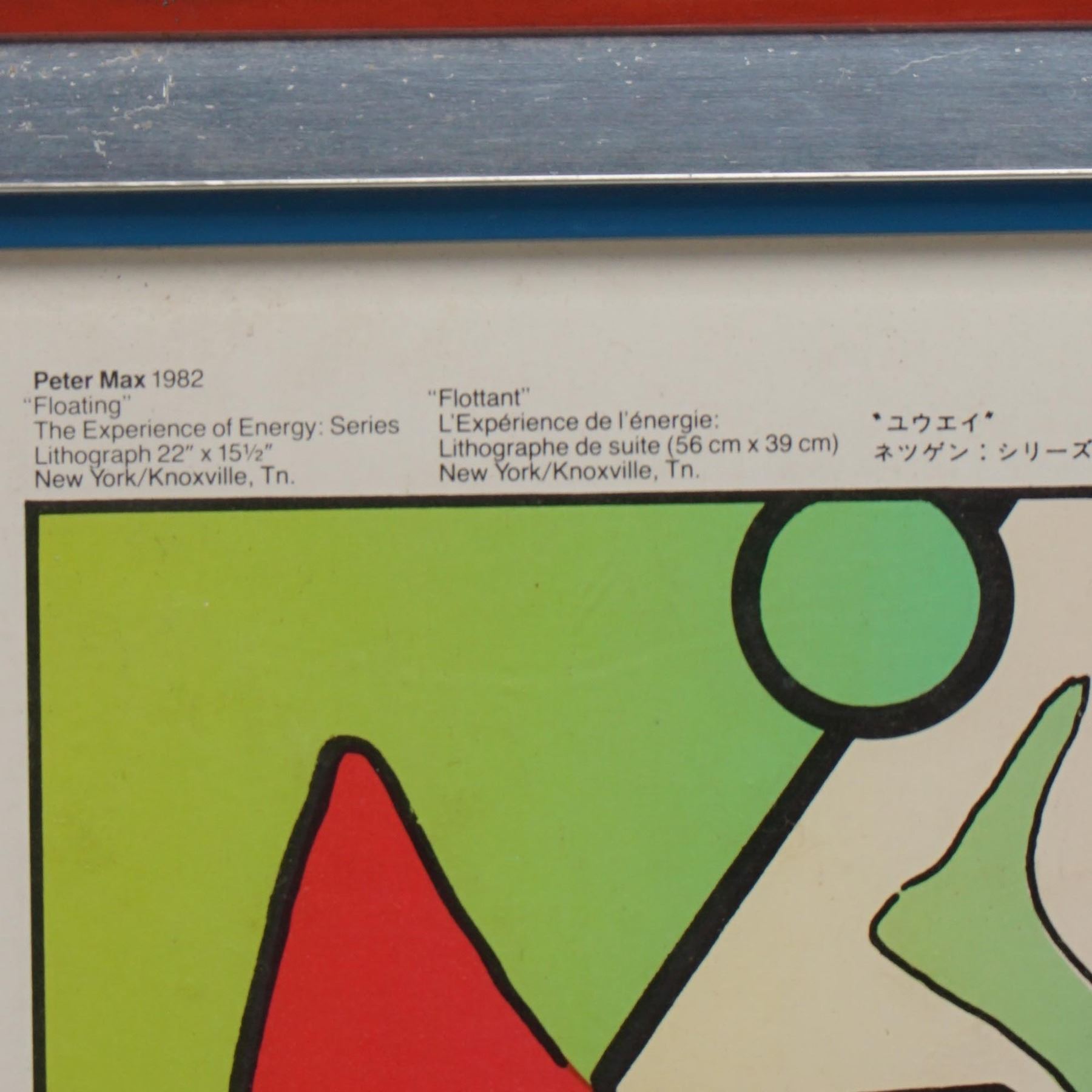 A vivid and energetic poster by pop art icon Peter Max, created as part of his “Experience of Energy” series for the 1982 World's Fair in Knoxville, Tennessee. This eye-catching work, titled Floating, exemplifies Max's signature bold color palette and surreal figures, blending patriotic flair with cosmic whimsy. The poster is hand signed by the artist in the upper left. Includes a Certificate of Authenticity. Measures approximately 21"H x 26"H.