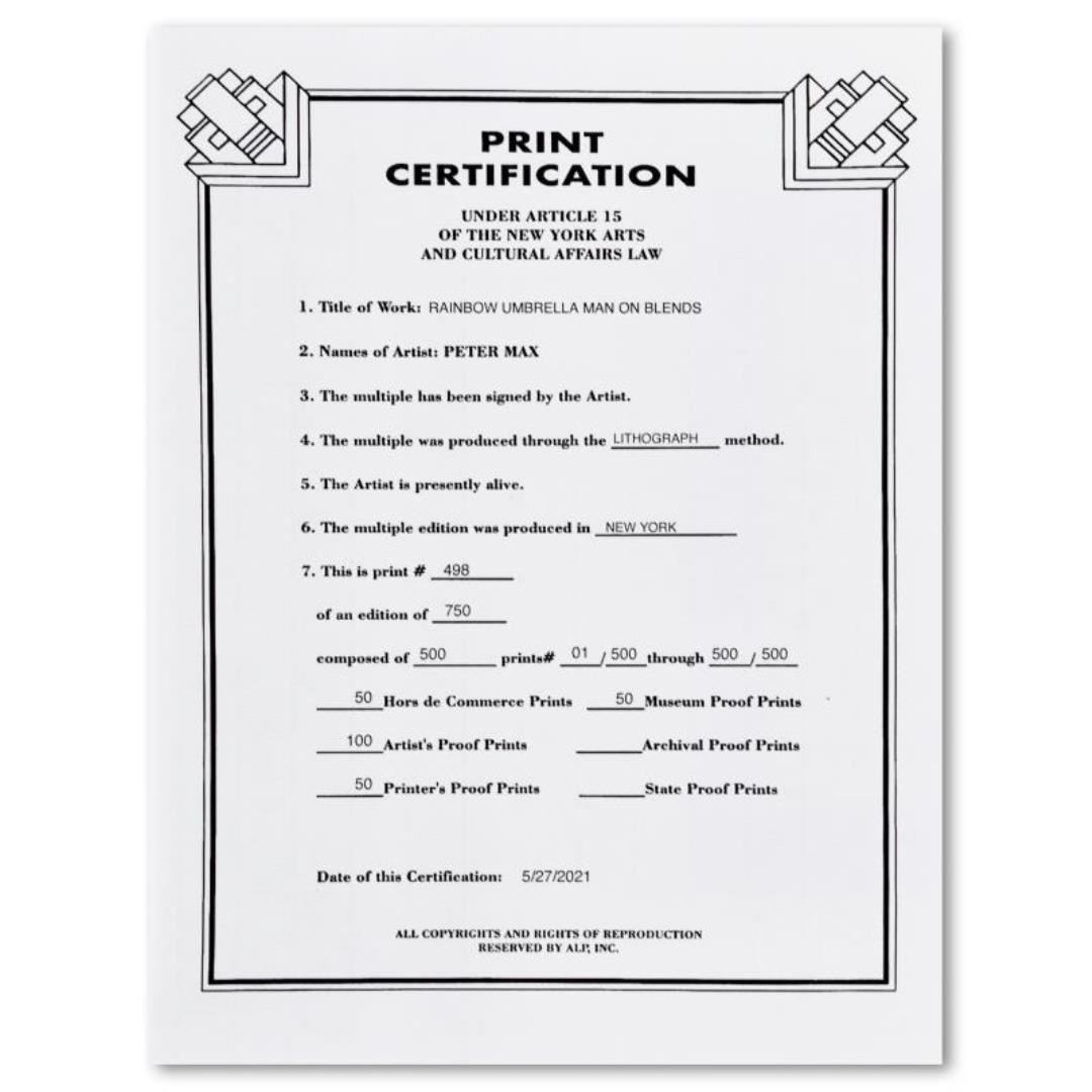 "Rainbow Umbrella Man on Blends" is a limited edition lithograph on paper by Peter Max, numbered 498/500 and hand signed by the artist. This piece comes framed. Includes Certificate of Authenticity from Peter Max Studios. Measures approximately 24" x 21.5" (frame), 13" x 10" (image).