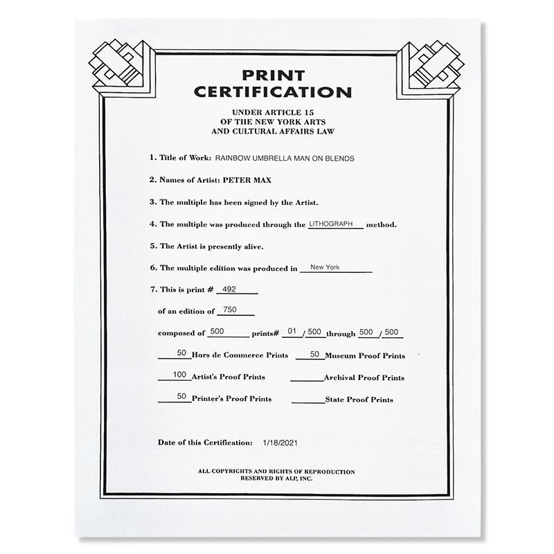 "Rainbow Umbrella Man on Blends" is a limited edition lithograph on paper by Peter Max, numbered 492/500 and hand signed by the artist. This piece comes framed and includes Certificate of Authenticity from Peter Max Studios. Measures approximately 24" x 26.5 (frame), 10" x 13" (image).