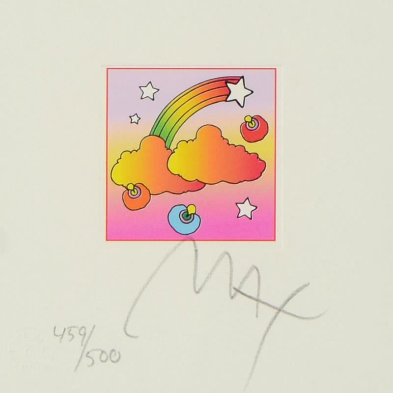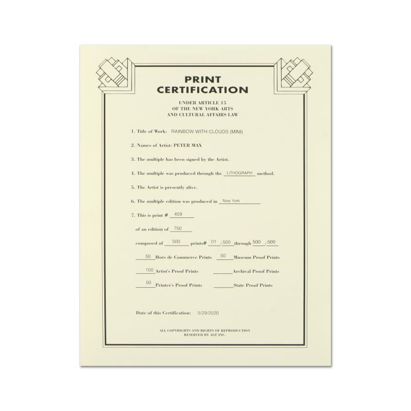 "Rainbow with Clouds" is a limited edition lithograph on paper by Peter Max, numbered 459/500 and hand signed by the artist. This piece comes framed and includes Certificate of Authenticity. Measures approximately 14" x 13.5" (frame), 5" x 4.5" (image).