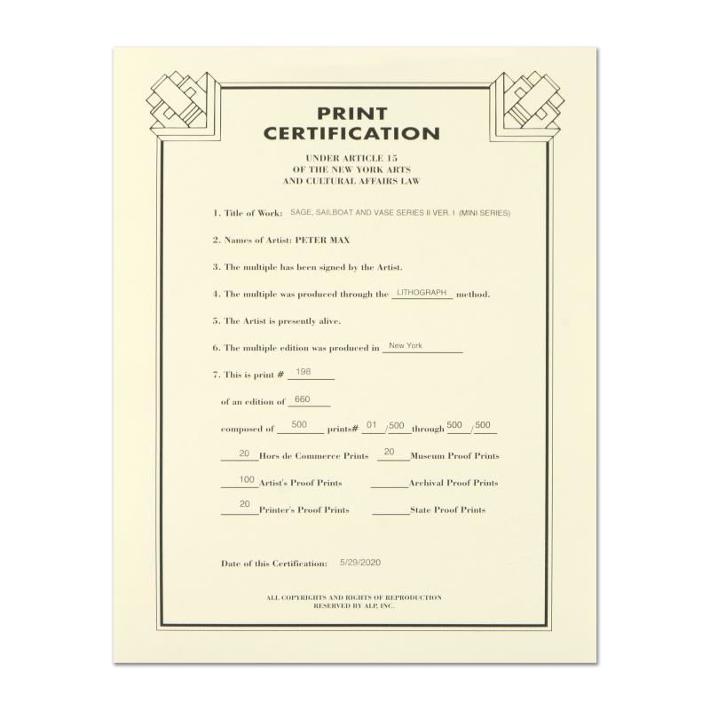 "Sage, Sailboat and Vase Series II" is a limited edition lithograph on paper by Peter Max, numbered 198/500 and hand signed by the artist. This piece comes framed and includes Certificate of Authenticity. Measures approximately 14" x 14" (frame), 3" x 3" (image).