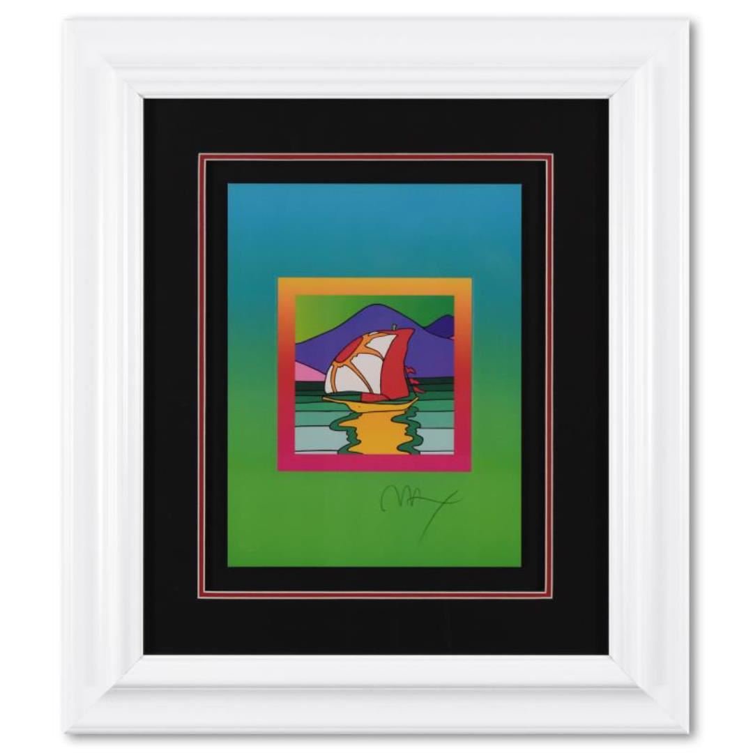 "Sailboat East on Blends" is a limited edition lithograph on paper by Peter Max, numbered 494/500 and hand signed by the artist. This piece comes framed. Includes Certificate of Authenticity from Peter Max Studios. Measures approximately 28" x 32" (frame), 13" x 17" (image).