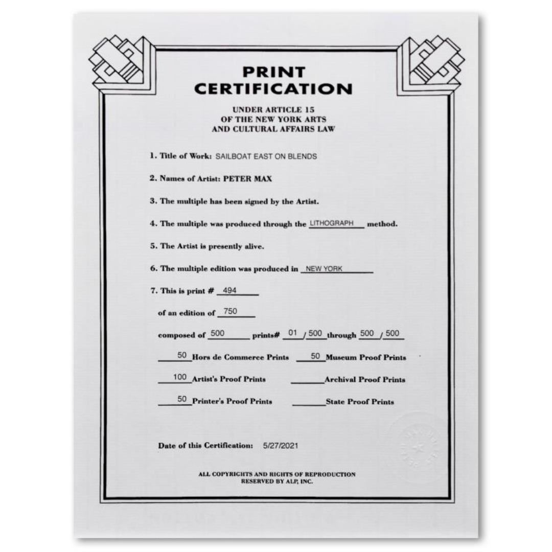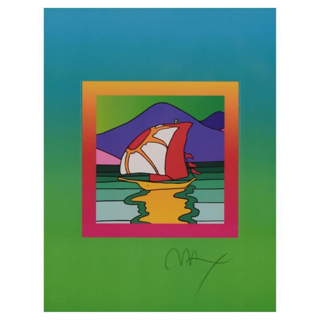 "Sailboat East on Blends" is a limited edition lithograph on paper by Peter Max, numbered 494/500 and hand signed by the artist. This piece comes framed. Includes Certificate of Authenticity from Peter Max Studios. Measures approximately 28" x 32" (frame), 13" x 17" (image).