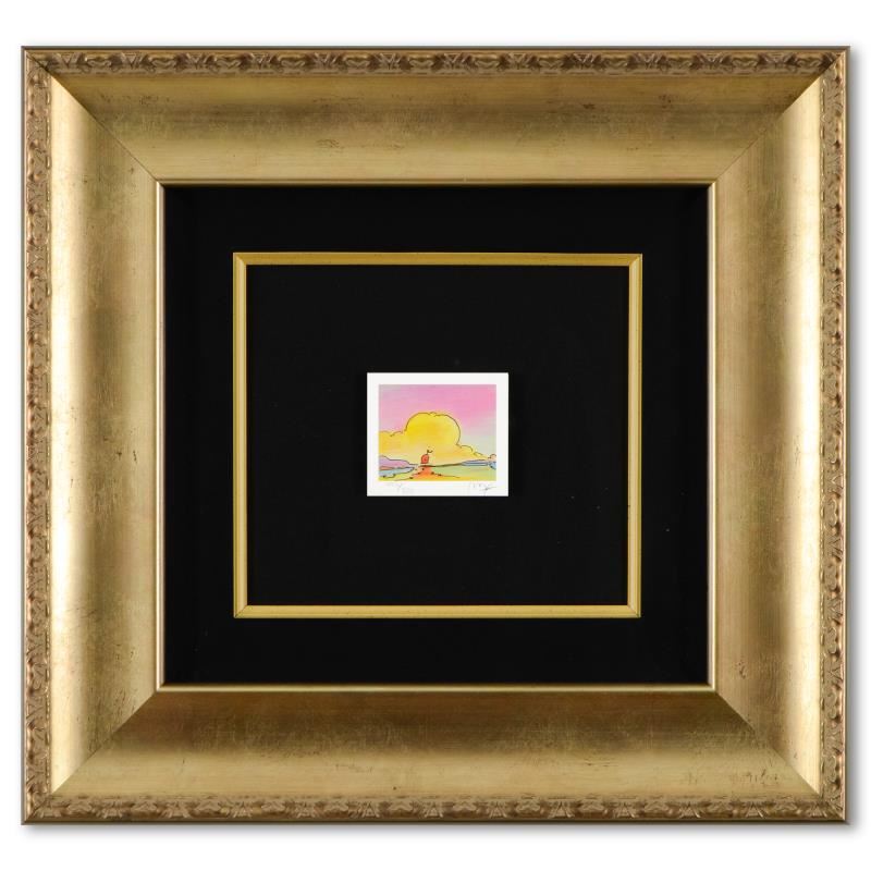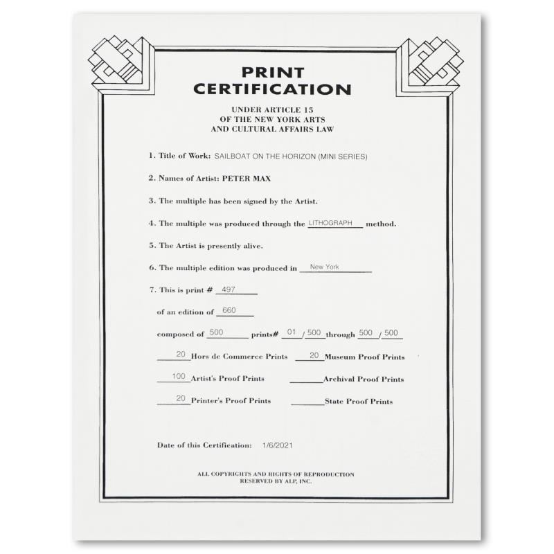 "Sailboat on the Horizon" is a limited edition lithograph on paper by Peter Max, numbered 497/500 and hand signed by the artist. This piece comes framed. Includes Certificate of Authenticity from Peter Max Studios. Measures approximately 18" x 17" (frame), 3" x 3" (image).