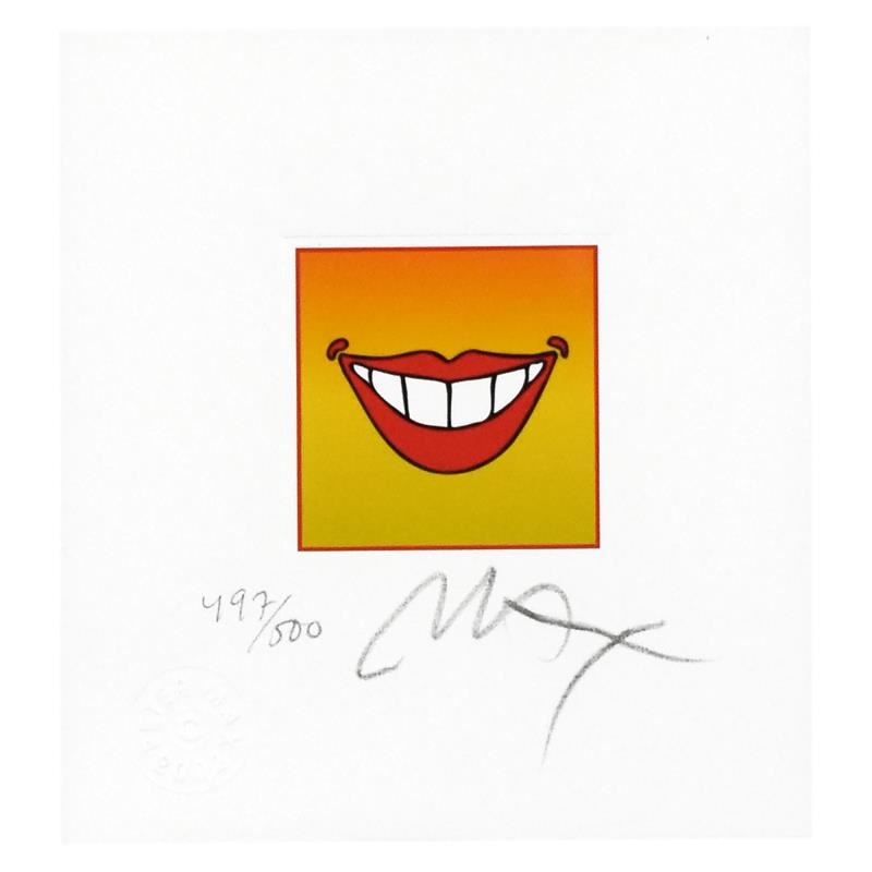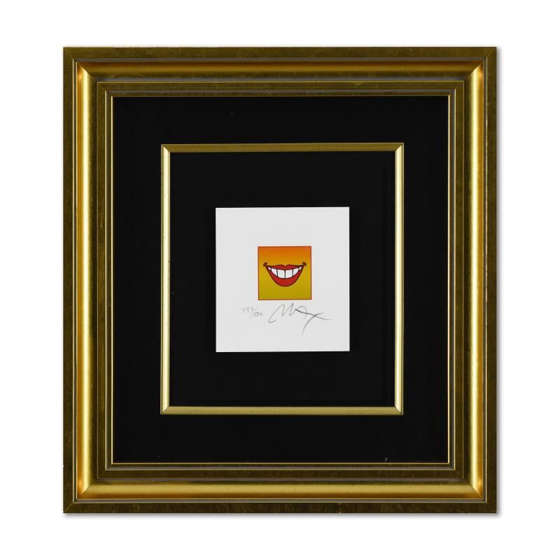 "Smile" is a limited edition lithograph on paper by Peter Max, numbered 497/500 and hand signed by the artist. This piece comes framed. Includes Certificate of Authenticity from Peter Max Studios. Measures approximately 14.5" x 15.5" (frame), 4.5" x 5" (image).