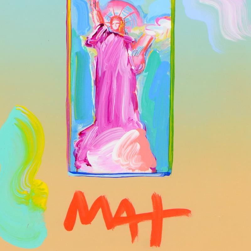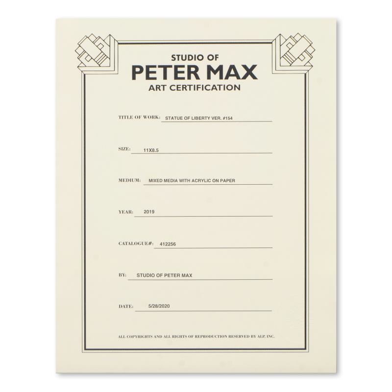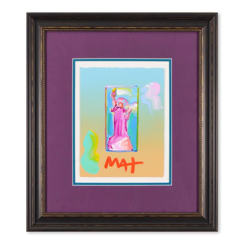 "Statue of Liberty" is a one-of-a-kind acrylic mixed media on paper, hand signed by Peter Max. This piece comes custom framed. Includes Certificate of Authenticity from Peter Max Studios. Measures approx. 19.5" x 22" (with frame), 8.5" x 11" (image).