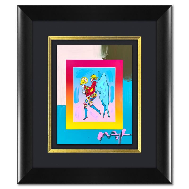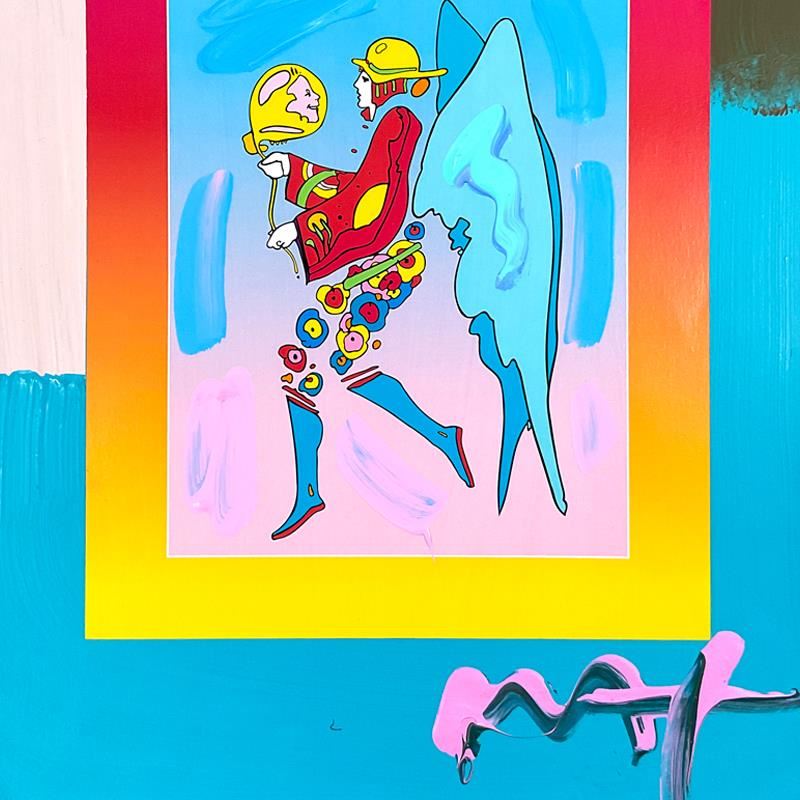 "Tip Toe Floating" is a one-of-a-kind acrylic mixed media on paper, hand signed by Peter Max. On the reverse side of this piece there is a registration number from Peter Max Studios certifying authenticity. This piece comes custom framed. Measures approx. 30" x 26" (frame), 17" x 13" (image).