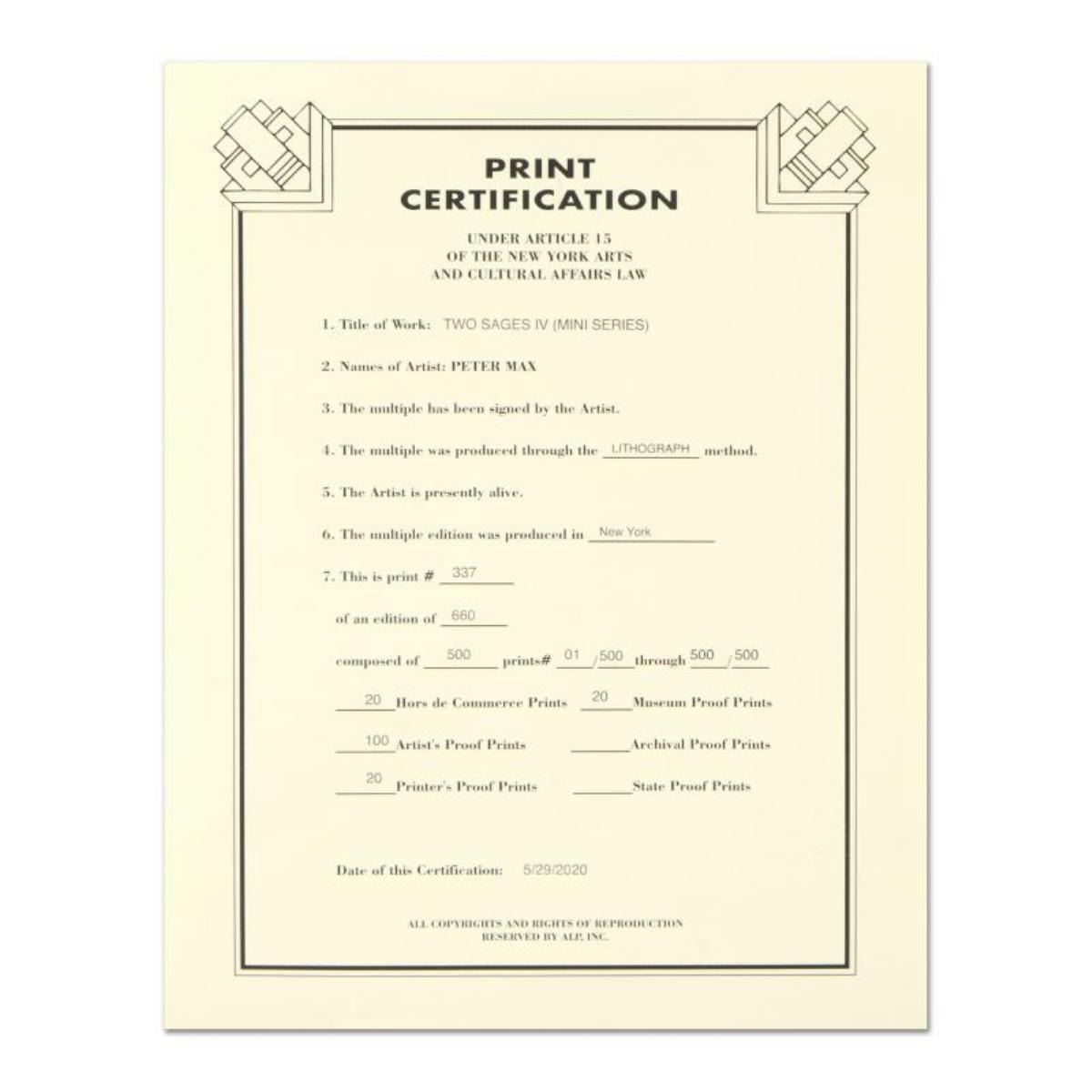 Peter Max, "Two Sages IV" Framed Limited Edition Lithograph, Numbered 337/500 and Hand Signed with Certificate of Authenticity. "Two Sages IV" is a limited edition lithograph on paper by Peter Max, numbered 337/500 and hand signed by the artist. This piece comes framed and includes Certificate of Authenticity. Measures approximately 13" x 13" (frame), 3" x 3" (image).