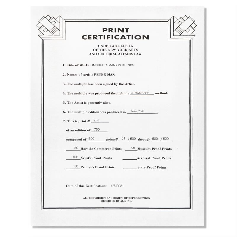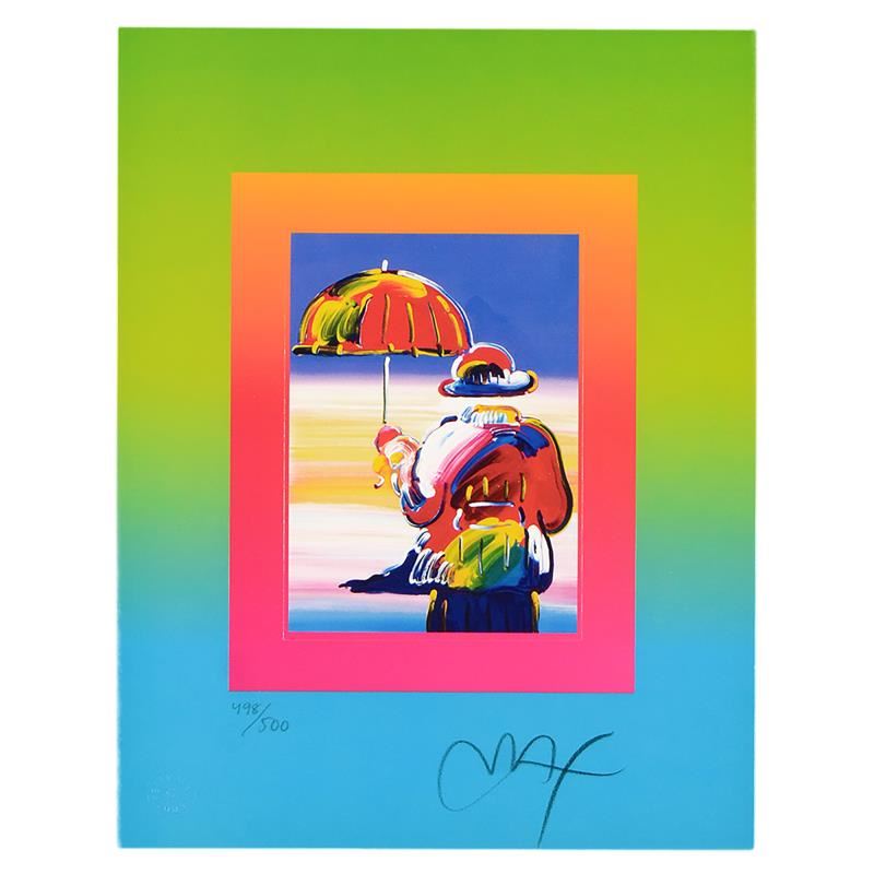 "Umbrella Man on Blends" is a limited edition lithograph on paper by Peter Max, numbered 498/500 and hand signed by the artist. This piece comes framed. Includes Certificate of Authenticity from Peter Max Studios. Measures approximately 22.5" x 25.5" (frame), 10" x 13" (image).
