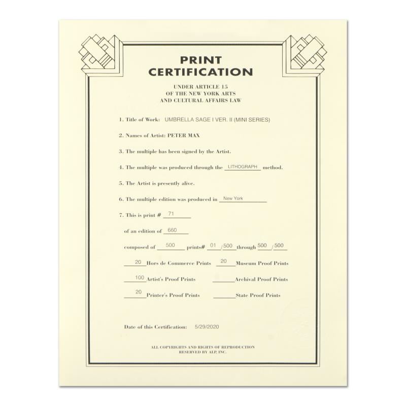 "Umbrella Sage I" is a limited edition lithograph on paper by Peter Max, numbered 71/500 and hand signed by the artist. This piece comes framed and includes Certificate of Authenticity. Measures approximately 13" x 13.5" (frame), 2.5" x 3" (image).