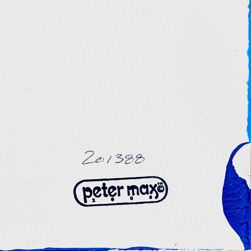 "United We Stand" is a one-of-a-kind mixed media on paper, hand signed by Peter Max. The piece comes custom framed with a backside cutout to display Peter Max Studio registration number 201388 certifying authenticity. Measures approximately 35" x 29" (frame), 24" x 18" (image).