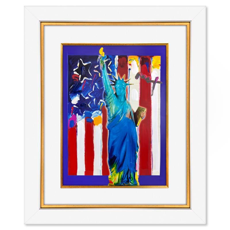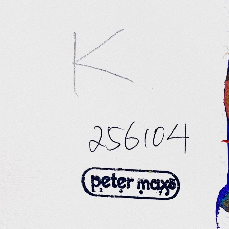 "United We Stand" is a one-of-a-kind mixed media on paper, hand signed by Peter Max. The piece comes custom framed with a backside cutout to display Peter Max Studio registration number 256104 certifying authenticity. Measures approximately 35" x 29" (frame), 24" x 18" (image).