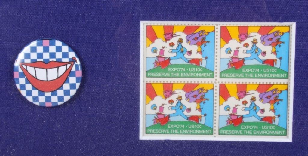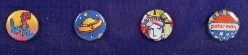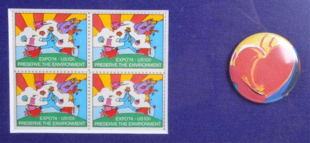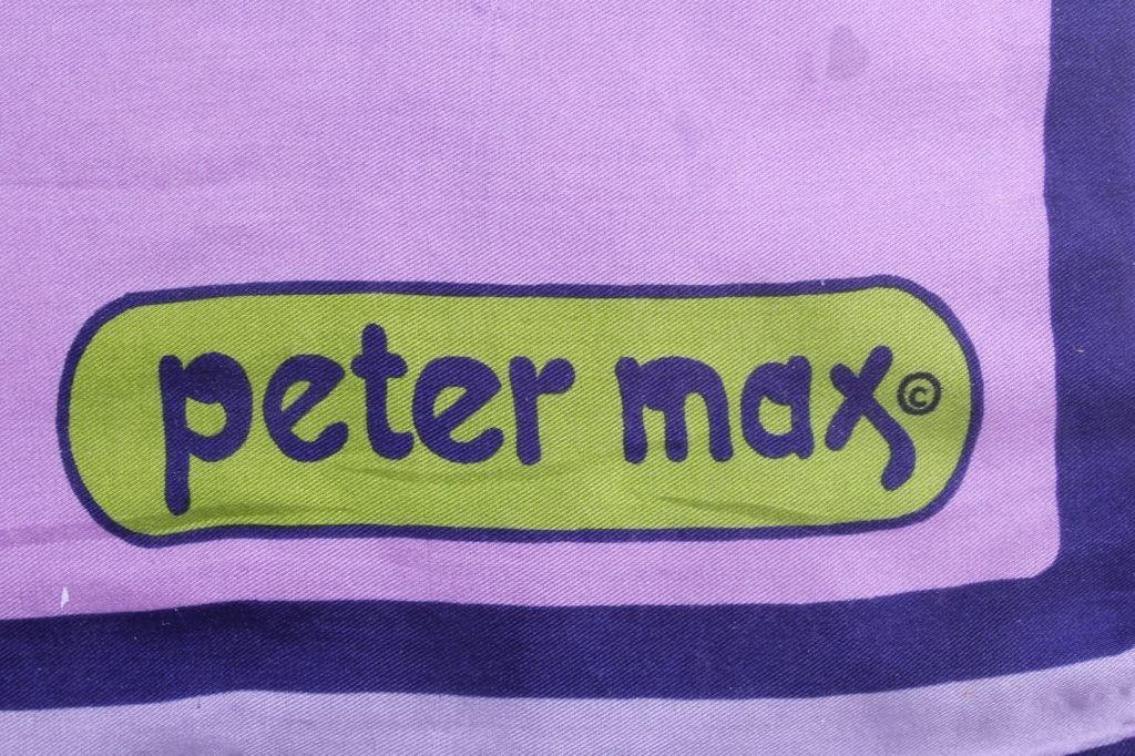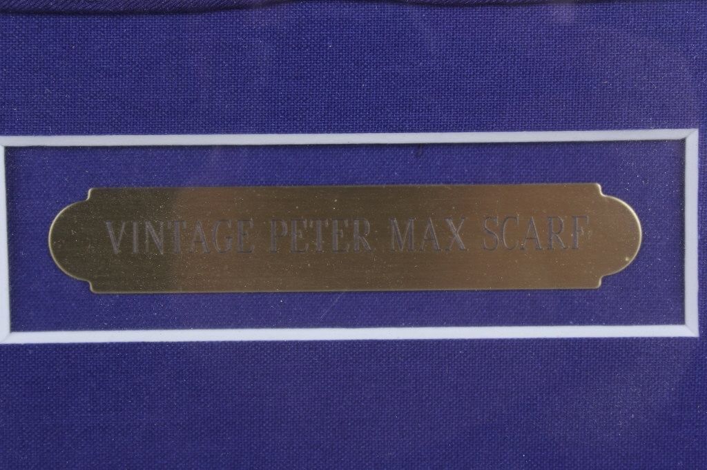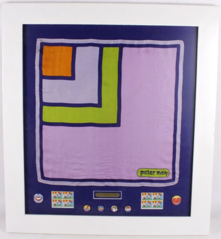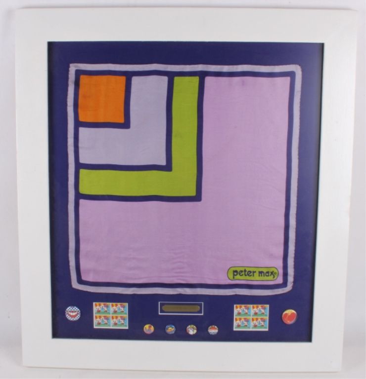 This is an authentic Peter Max scarf showing a great design and his name in the lower right. This is done in a white frame with a red background and also shows 6 original buttons and 8 stamps. All of these are fromthe world renowned artist, Peter Max. Peter Max art exceeds 25 million at auction and is extremely collectible. The frame measures 31.25"x33.25" and the art area is 24.25"x27.25"